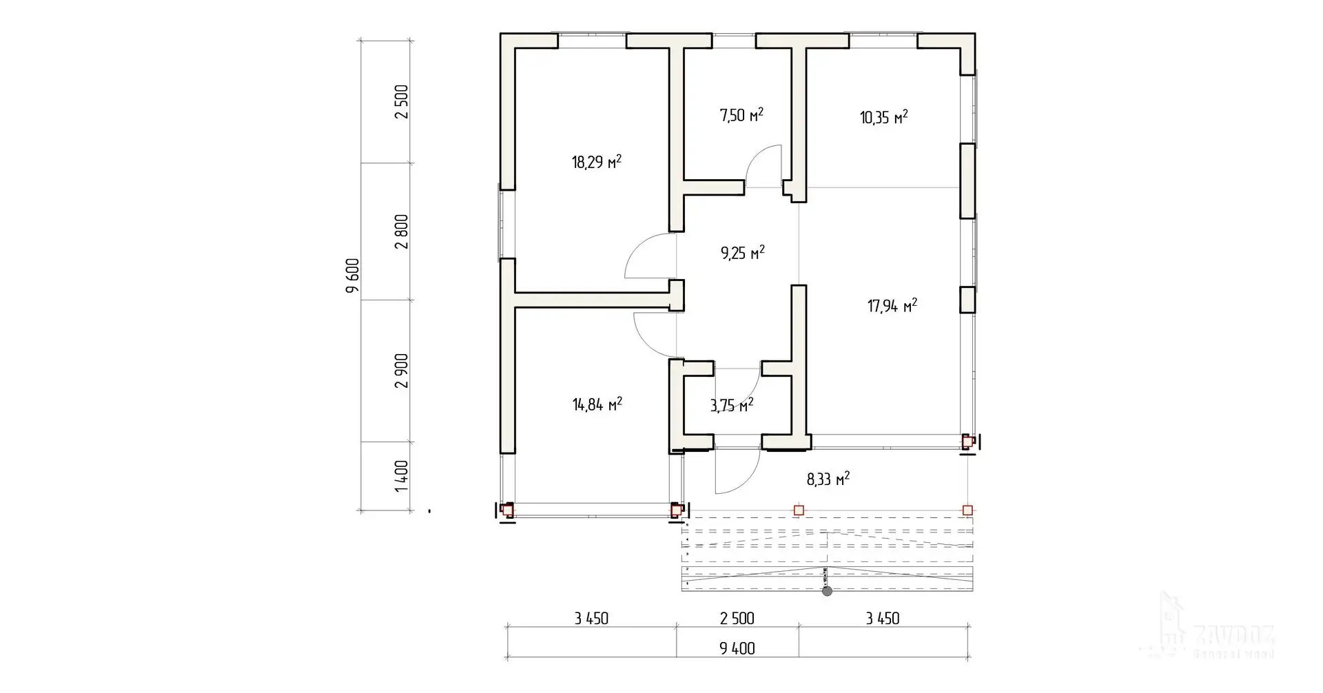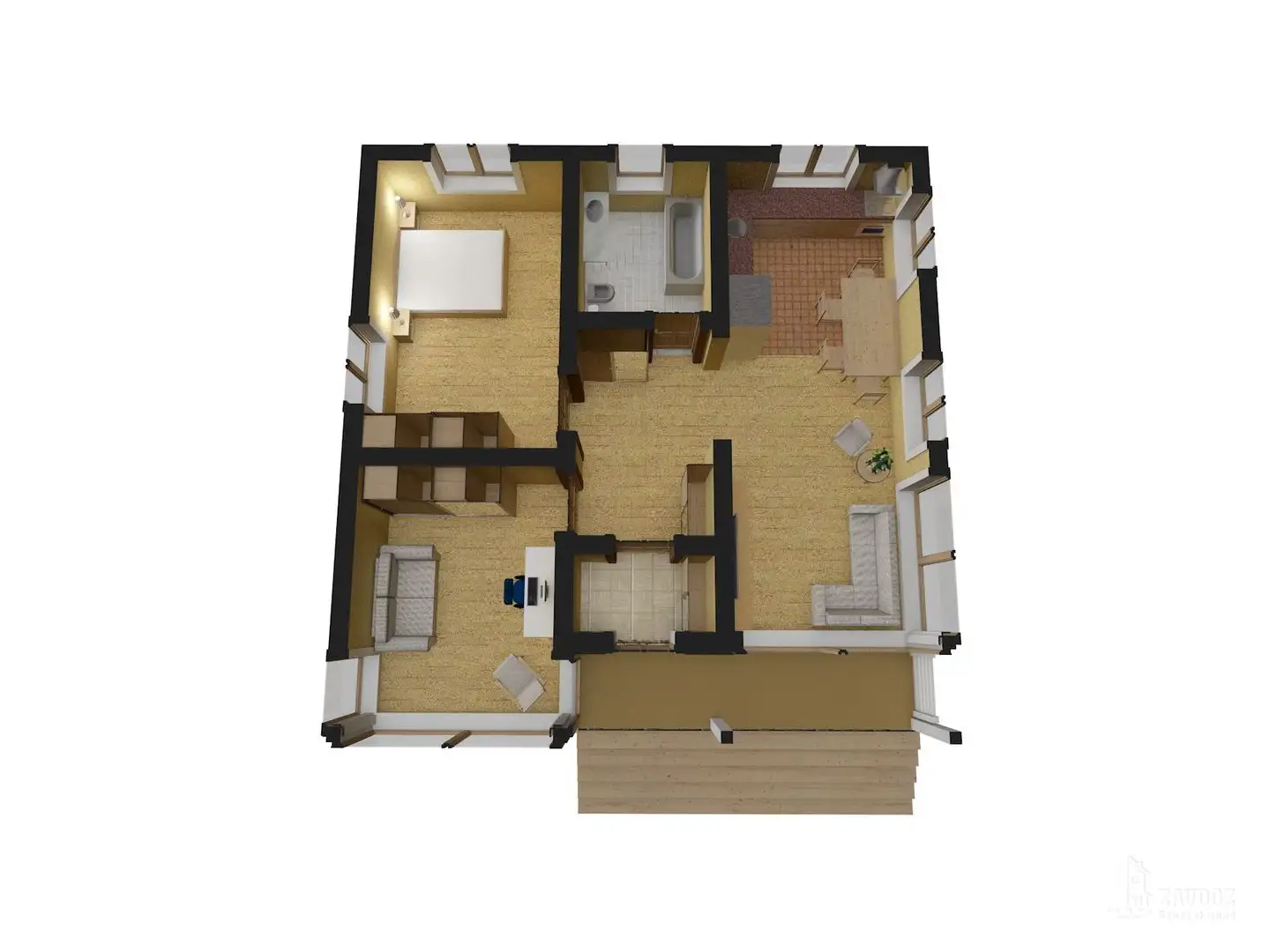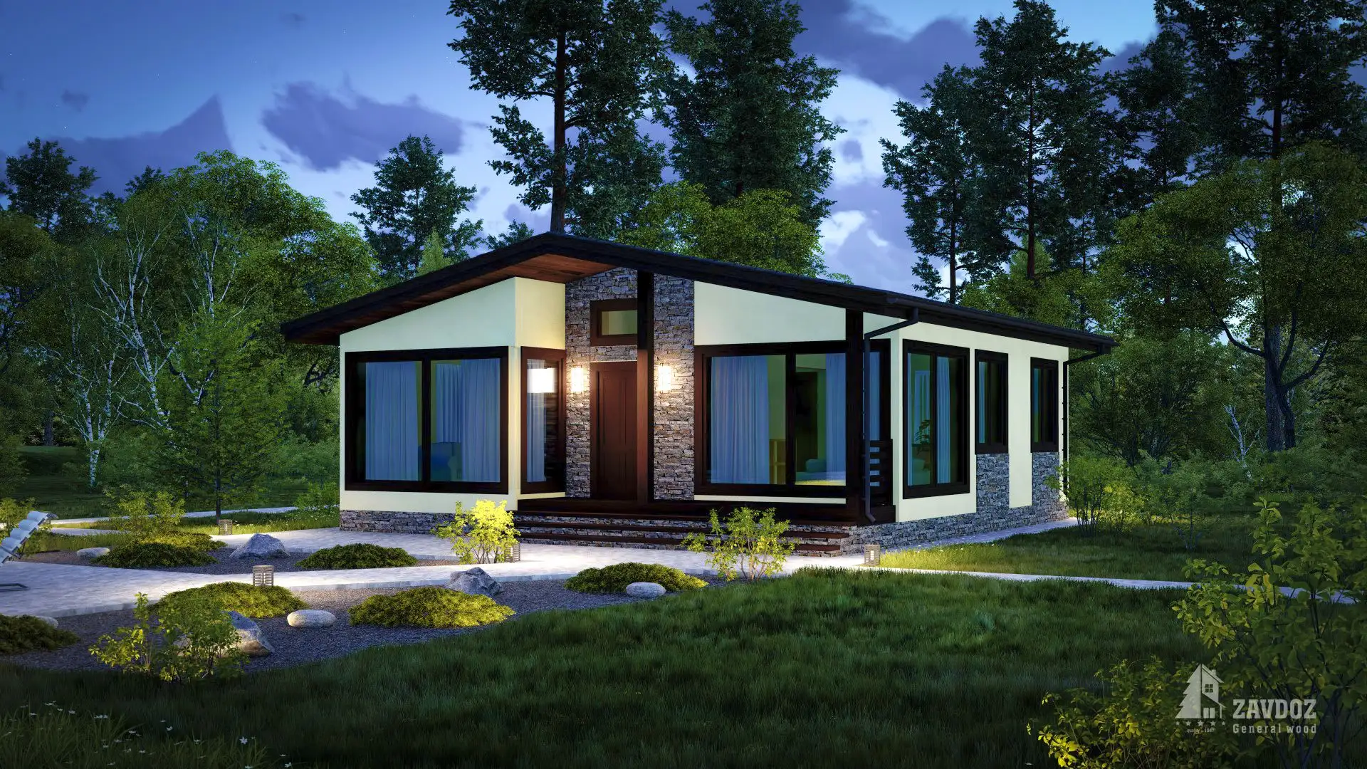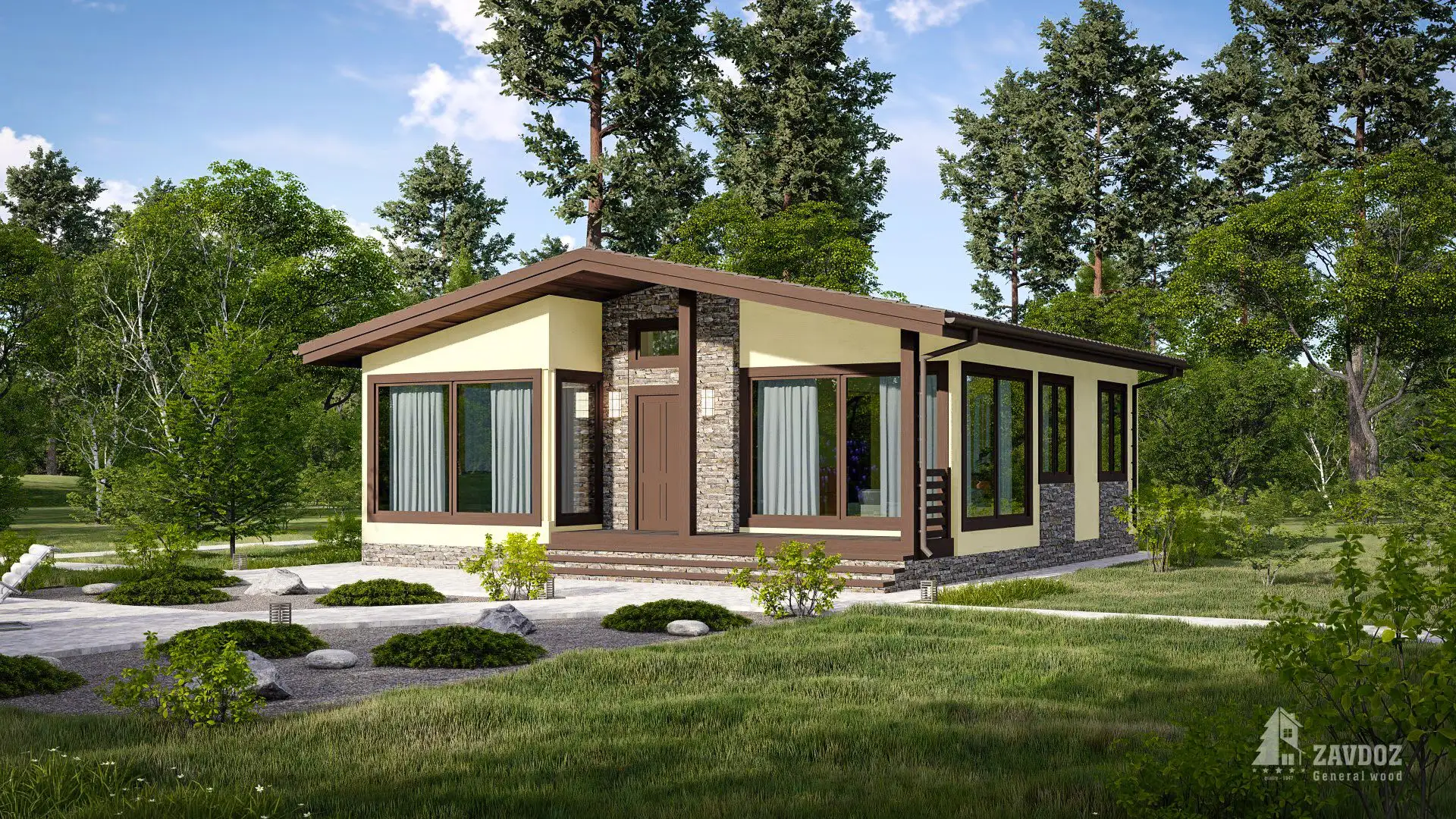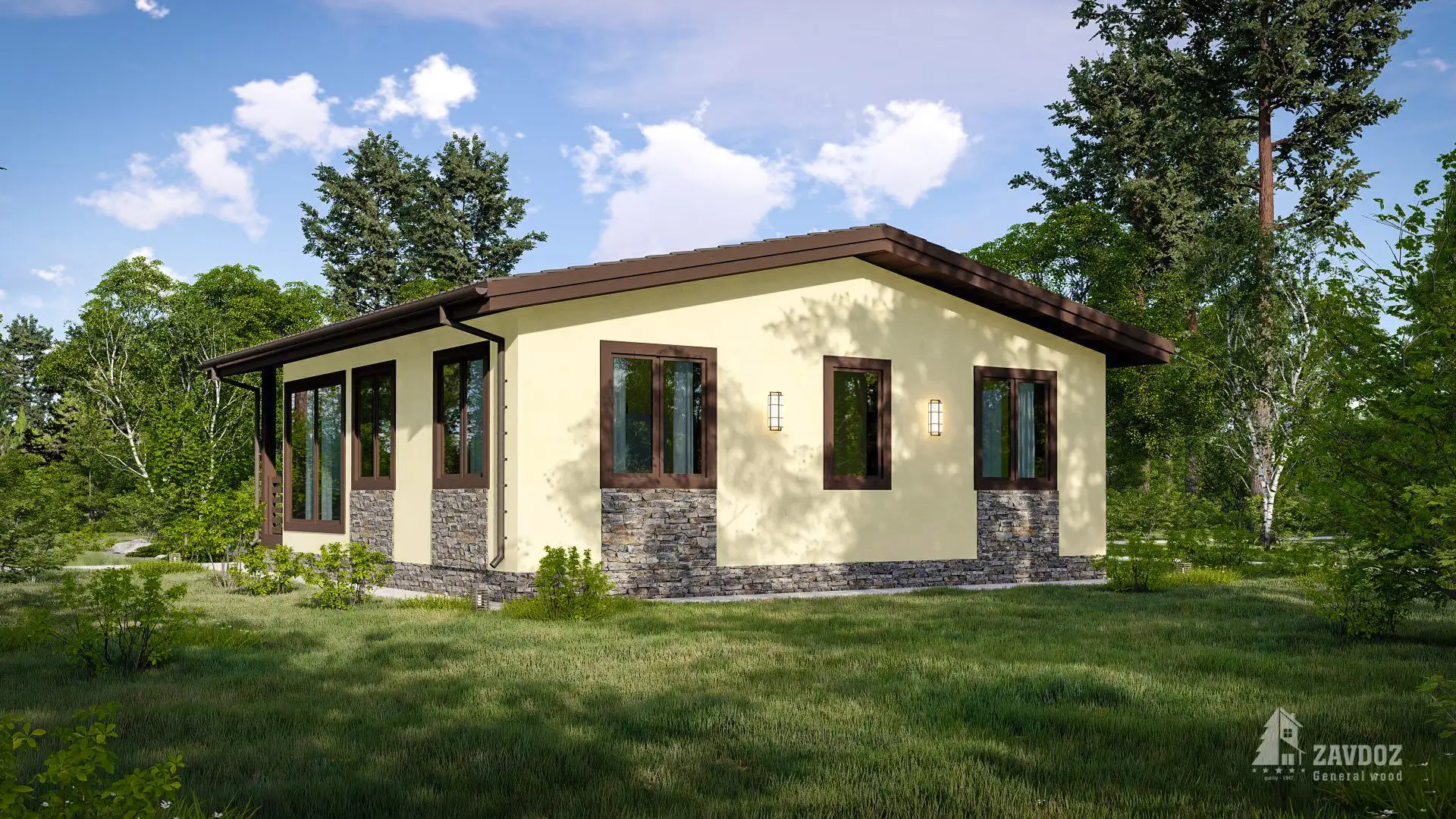 Небольшой, но вместительный одноэтажный дом из кирпича. Удобная планировка сочетает в себе как зоны для отдыха, так и пространство для работы — просторный кабинет. Кухня-гостиная, уютная спальня и отдельный санузел.