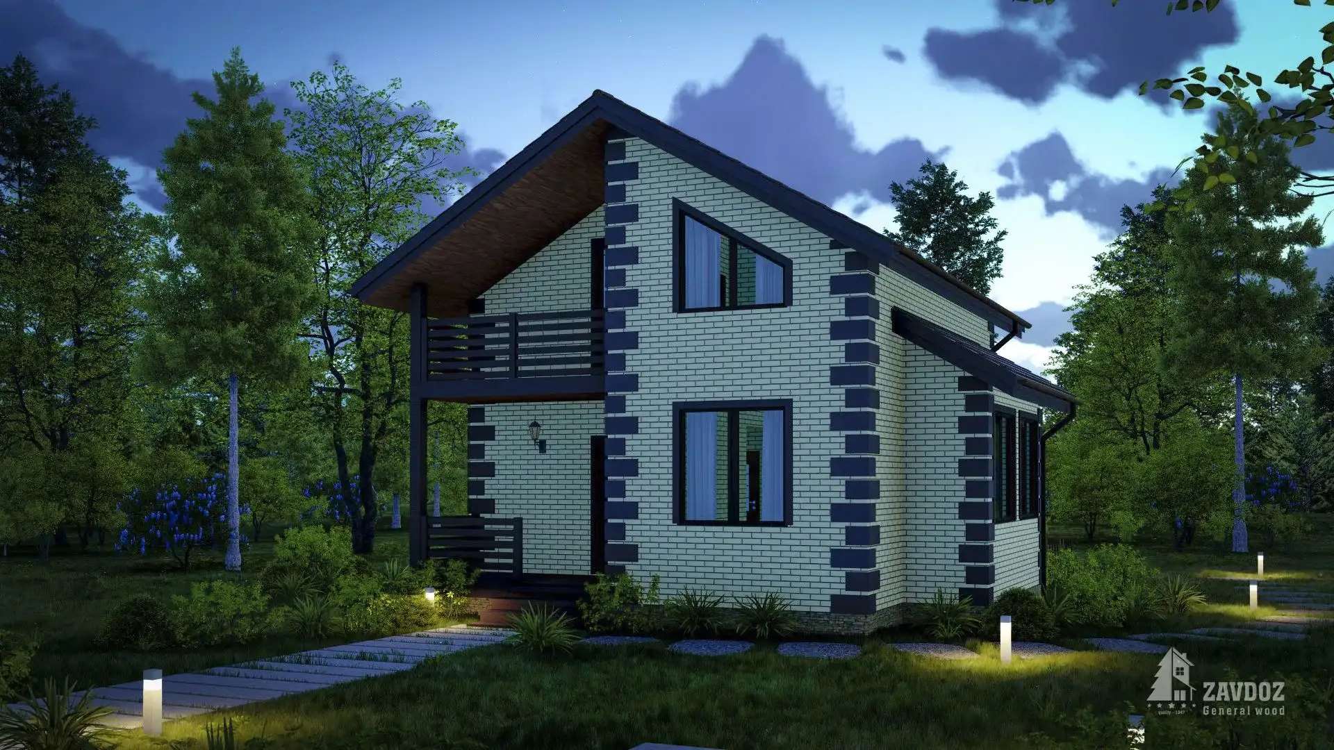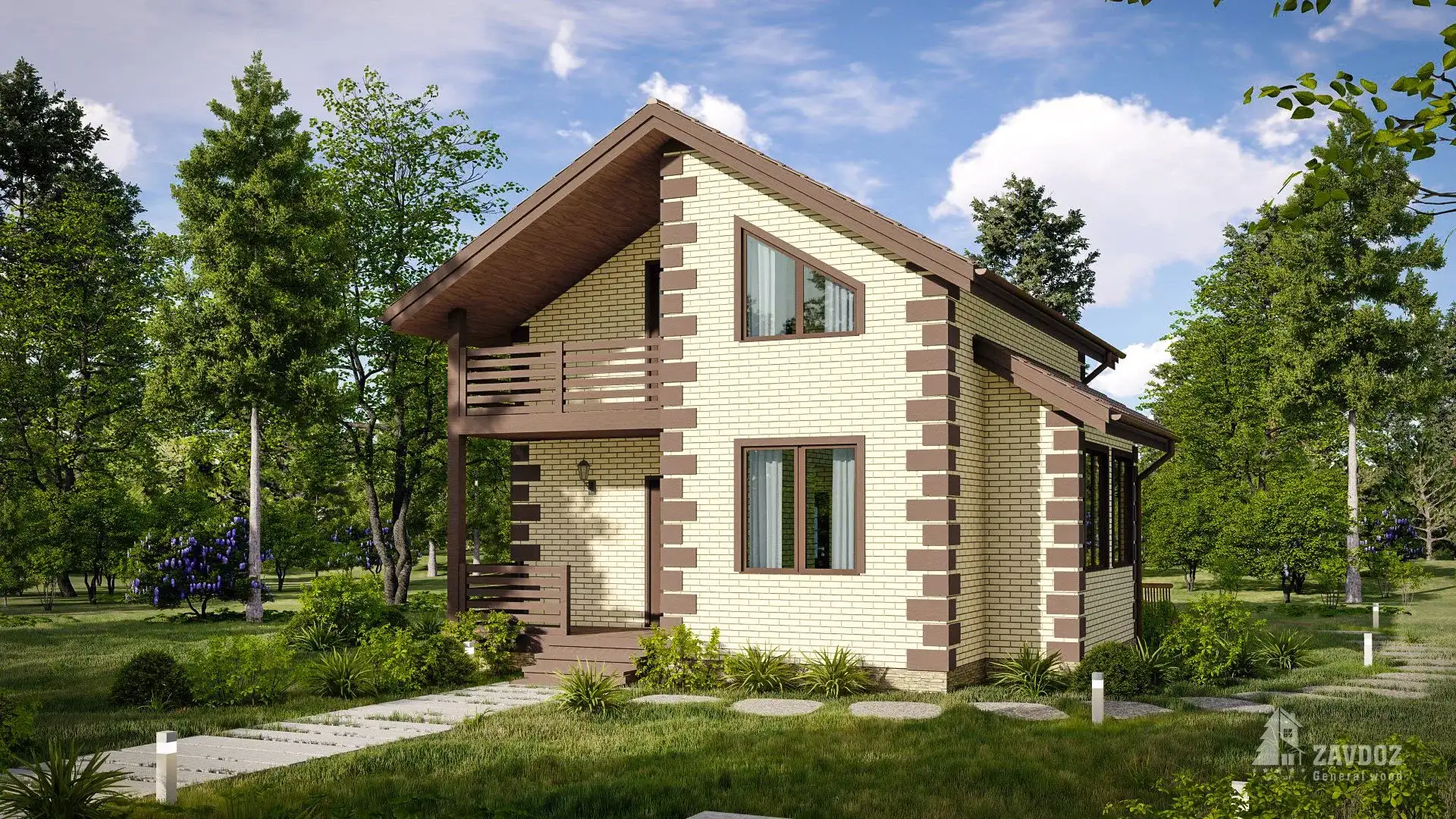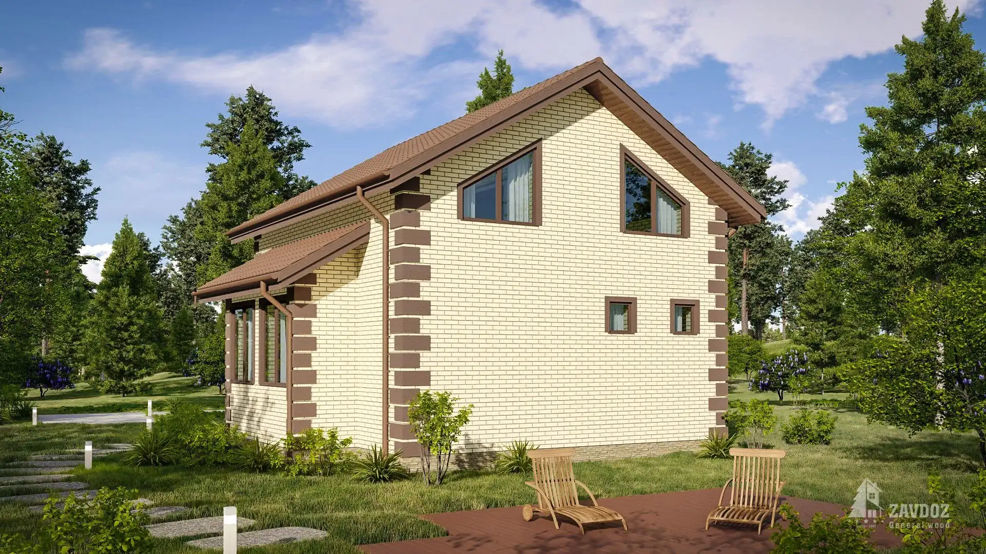 Ассиметричный дом из кирпича с двускатной крышей. На двух жилых этажах расположены просторная кухня-гостиная, гостевой санузел, 2 уединенные спальни и душевая. Небольшой балкон на втором этаже и терраса со стороны входной группы.