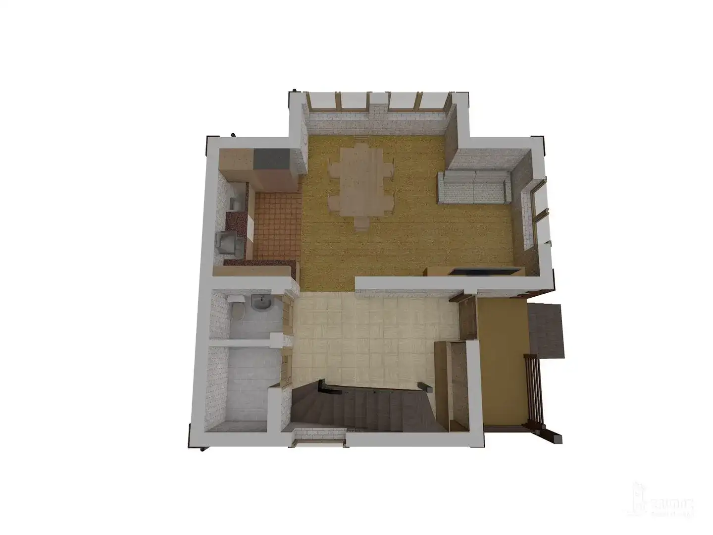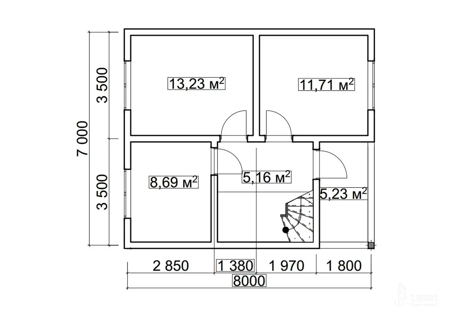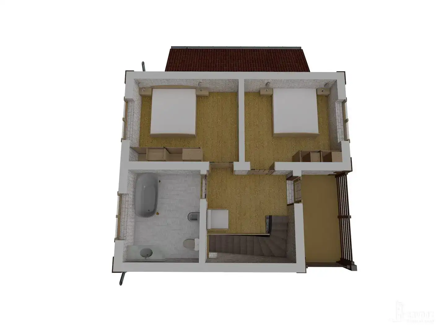 Ассиметричный дом из кирпича с двускатной крышей. На двух жилых этажах расположены просторная кухня-гостиная, гостевой санузел, 2 уединенные спальни и душевая. Небольшой балкон на втором этаже и терраса со стороны входной группы.