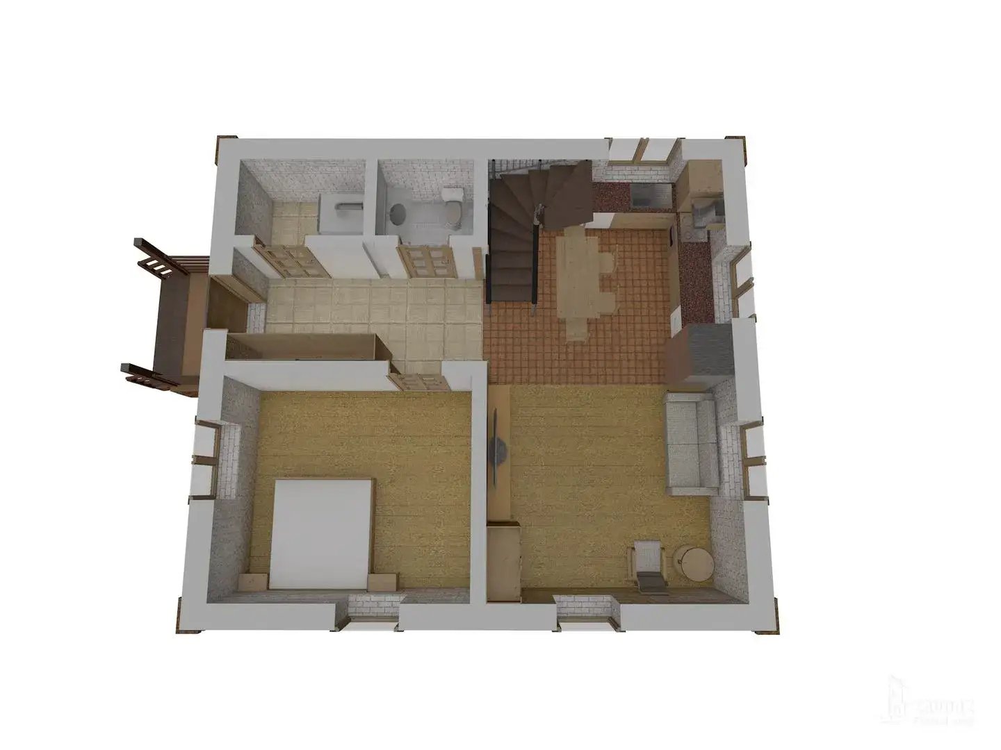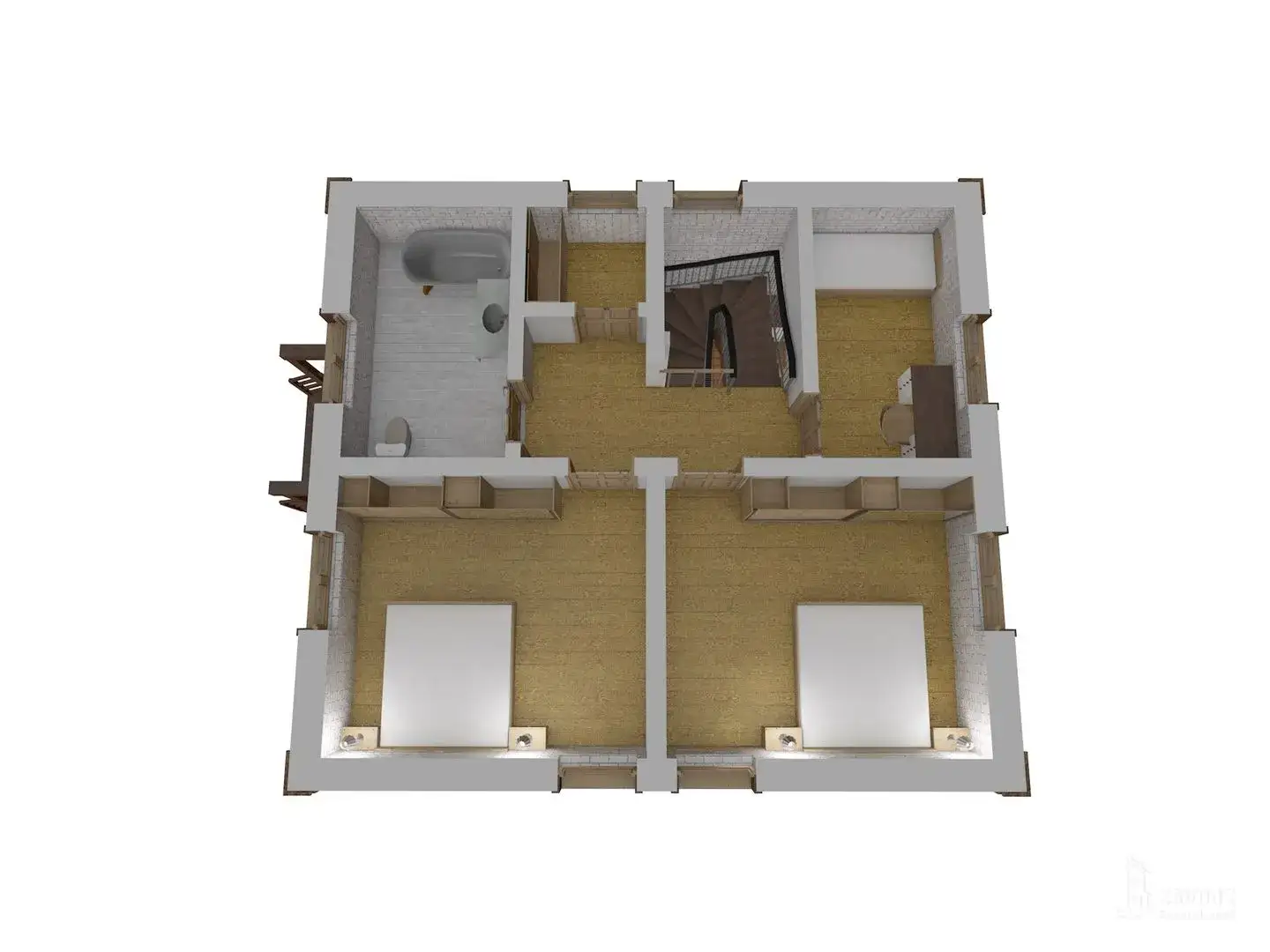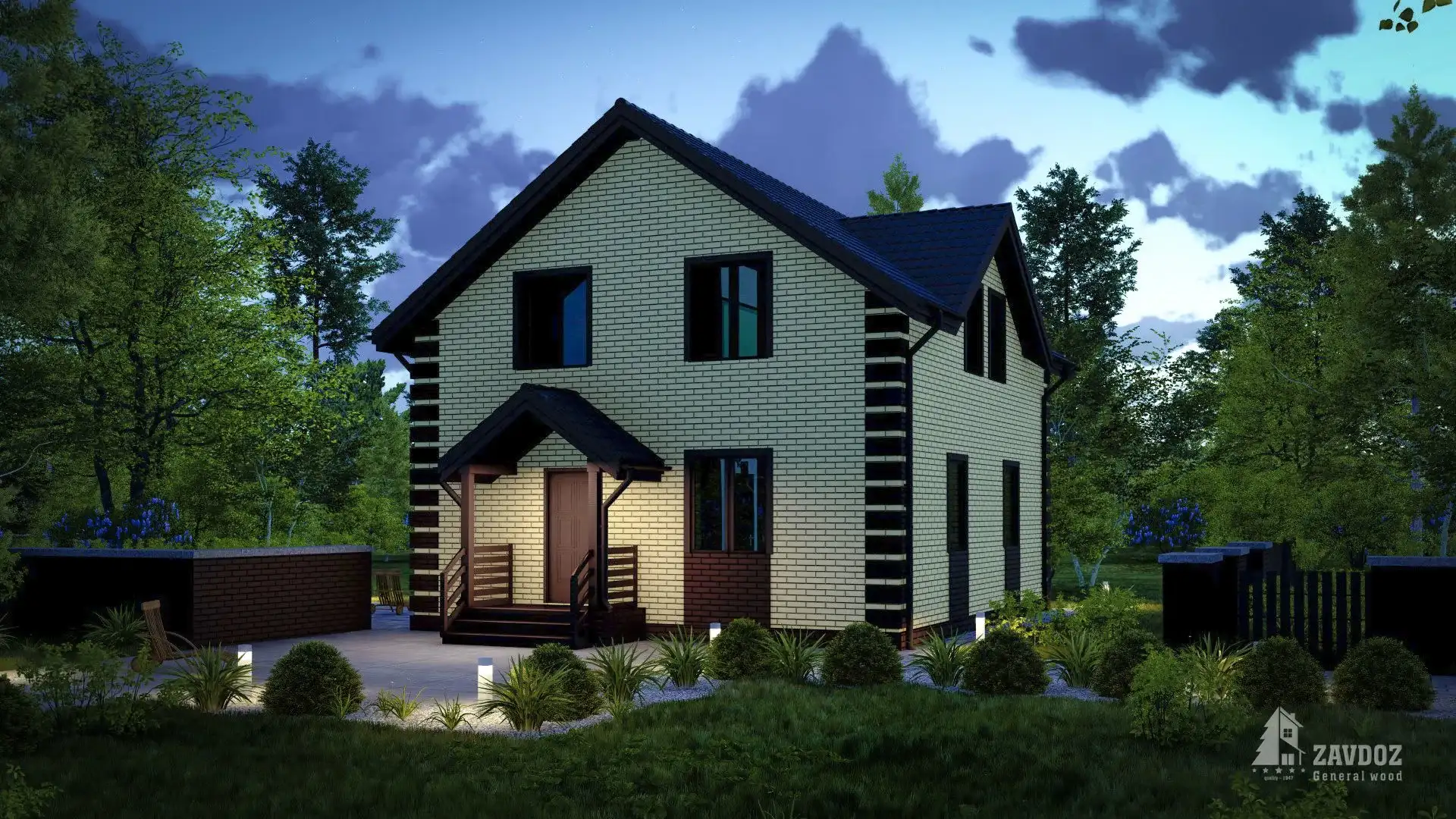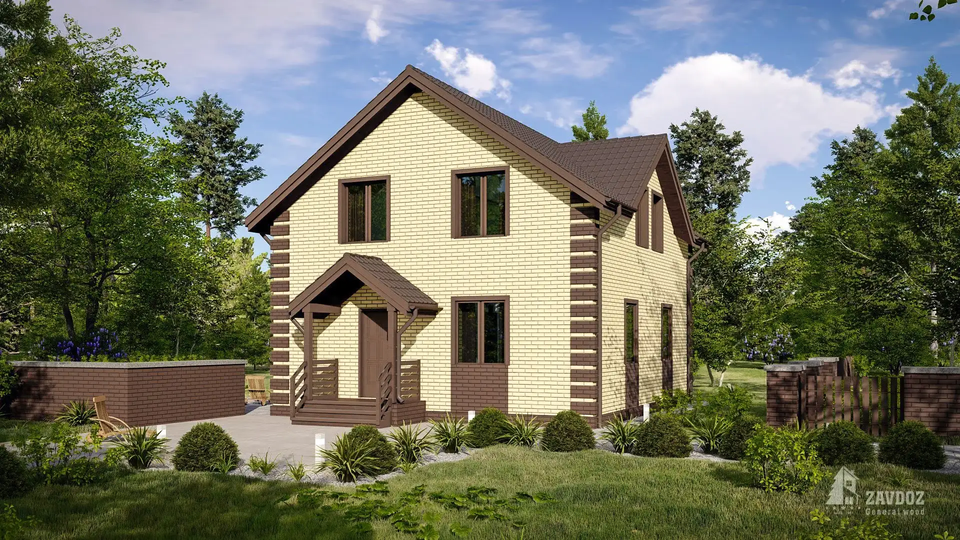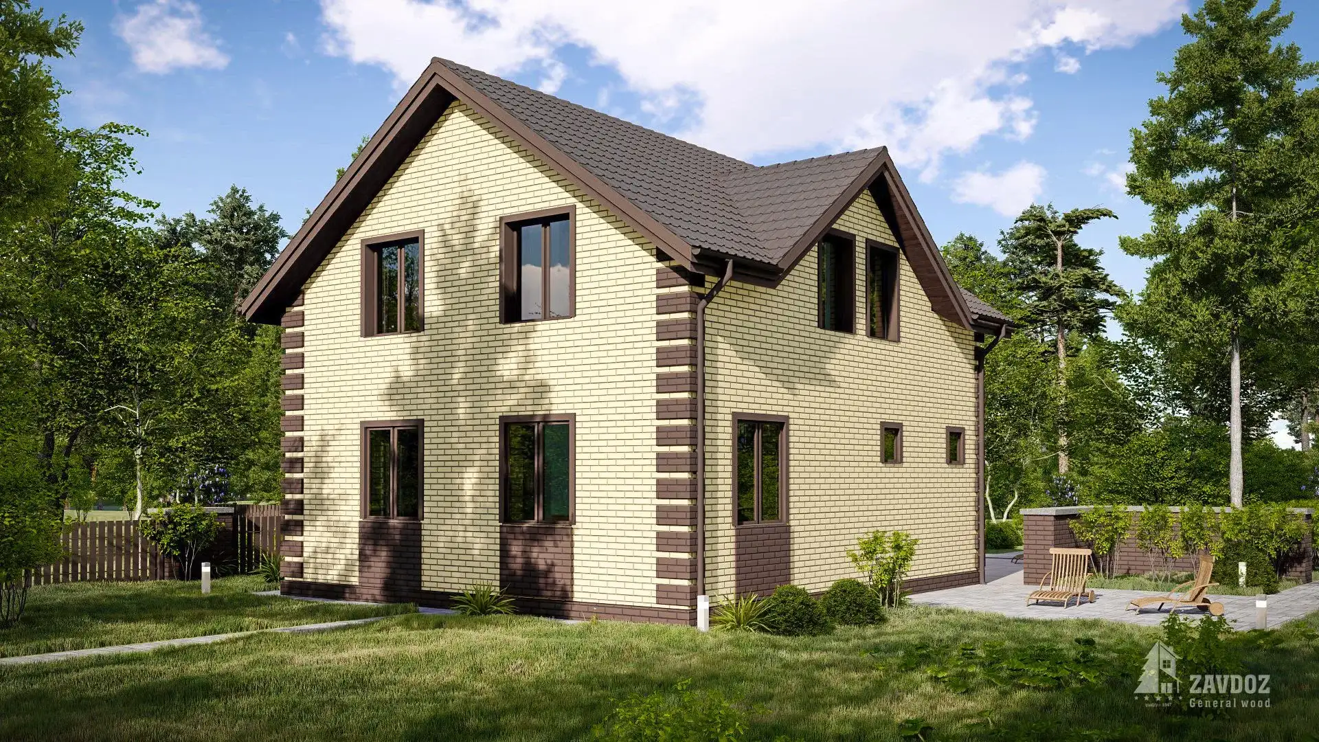 Классический двухэтажный дом из кирпича — оптимальное решение для небольшой семьи. Общие зоны и просторная спальня на первом этаже и 3 небольшие спальни с отдельной душевой и кладовой на втором.