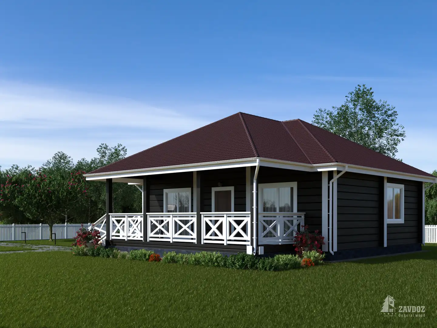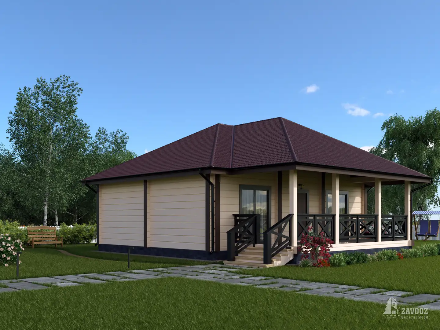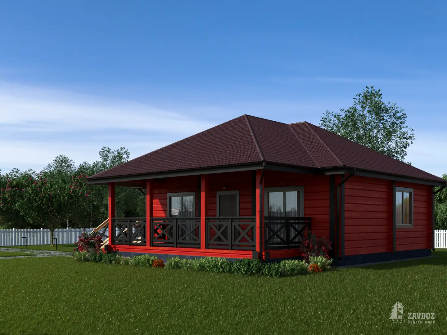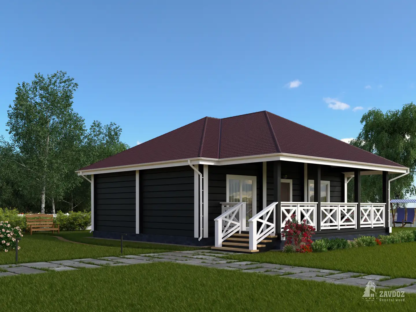 Одноэтажный дом из клееного бруса в скандинавском стиле с 2 комнатами и террасой
