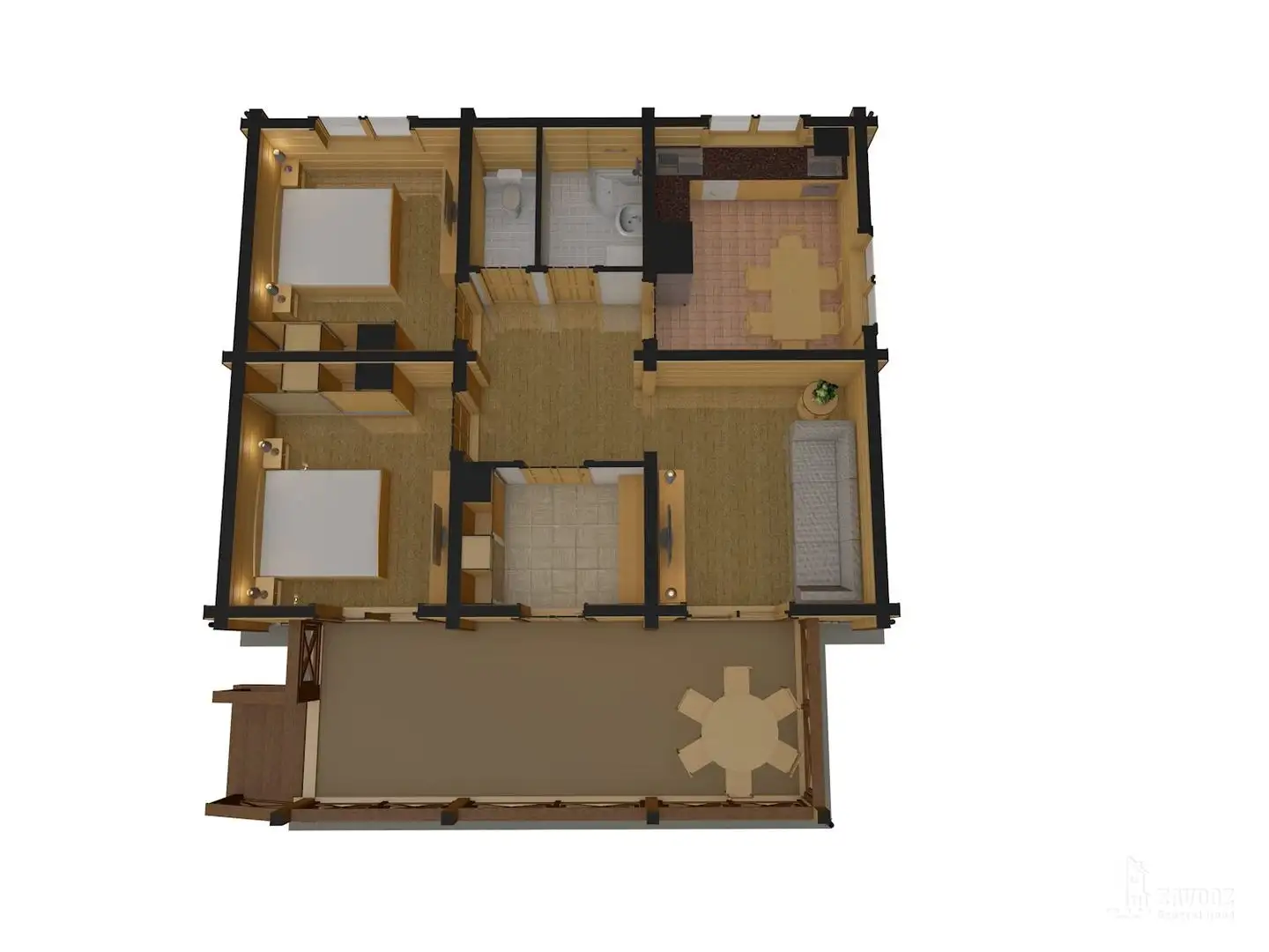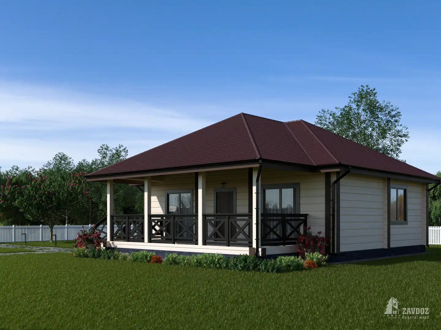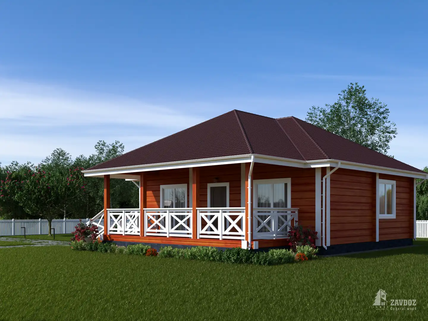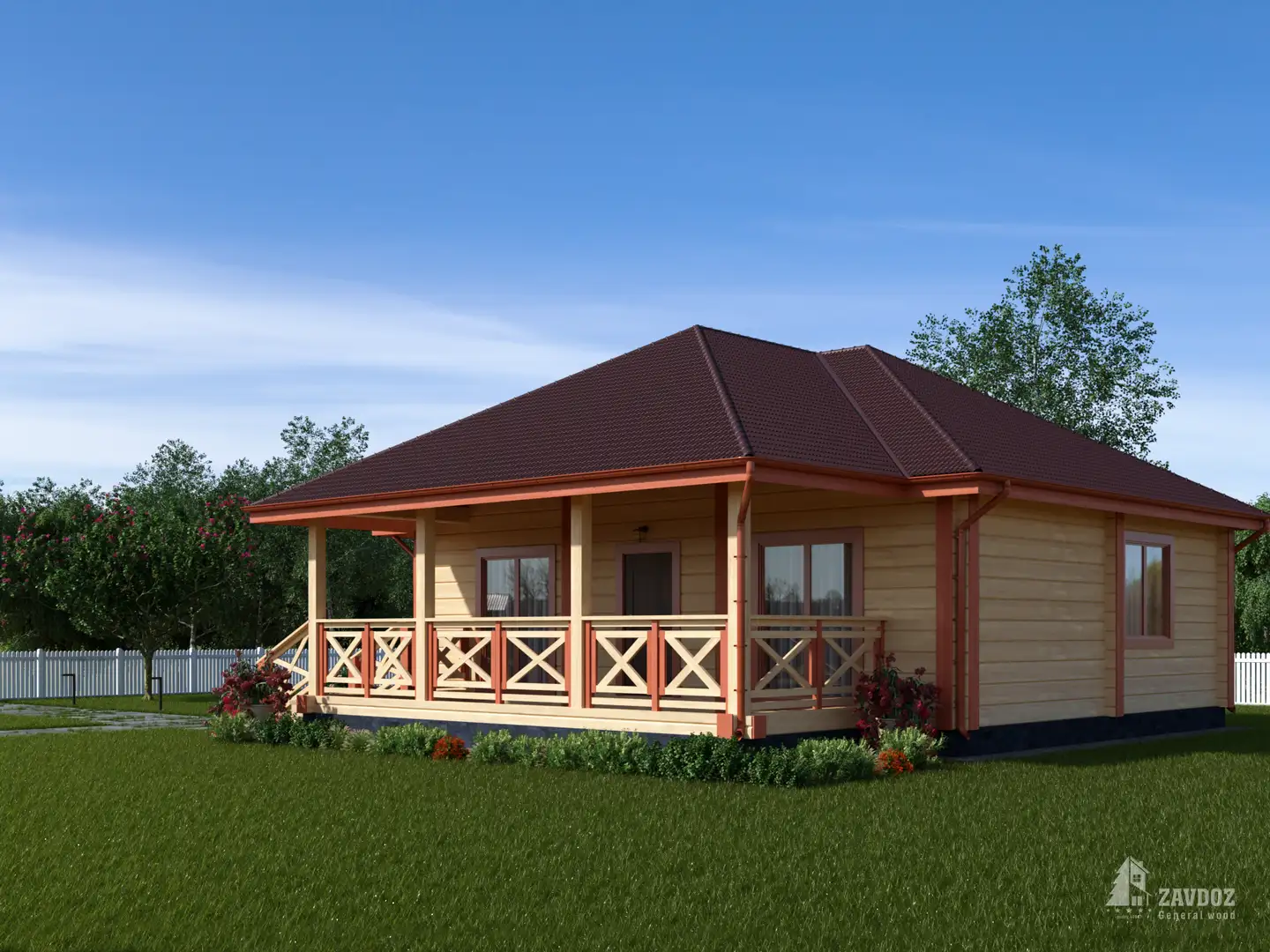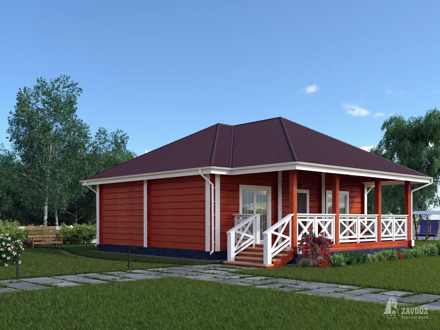 Одноэтажный дом из клееного бруса в скандинавском стиле с 2 комнатами и террасой