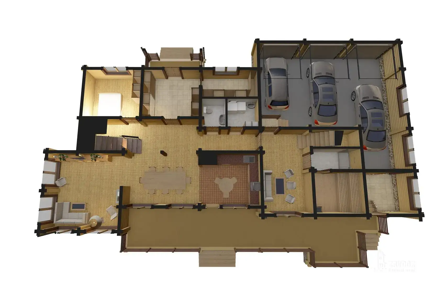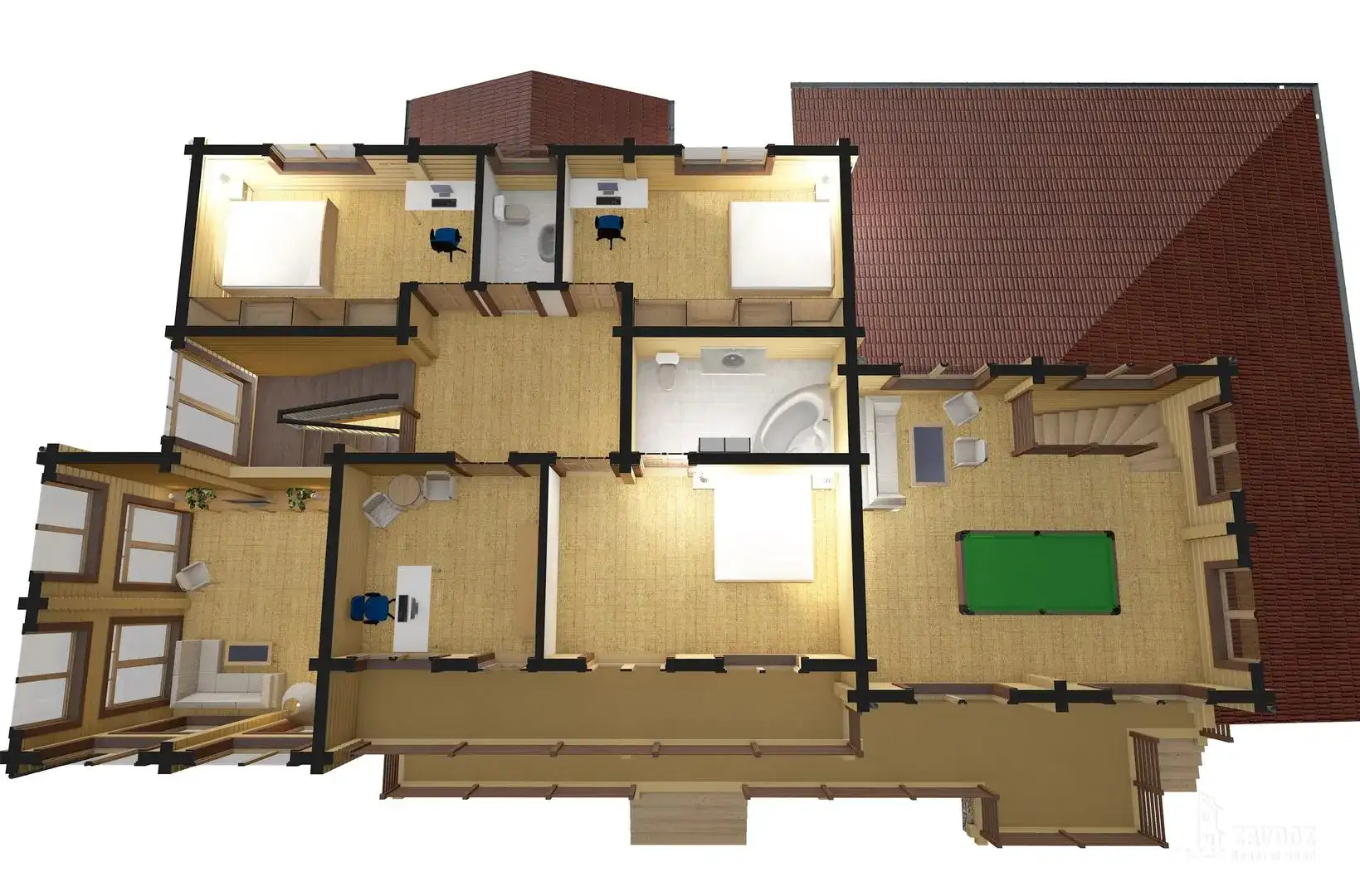 Двухэтажный дом из клееного бруса в русском стиле с 4 комнатами, 4 санузлами, террасой, балконом, гаражом и бильярдной