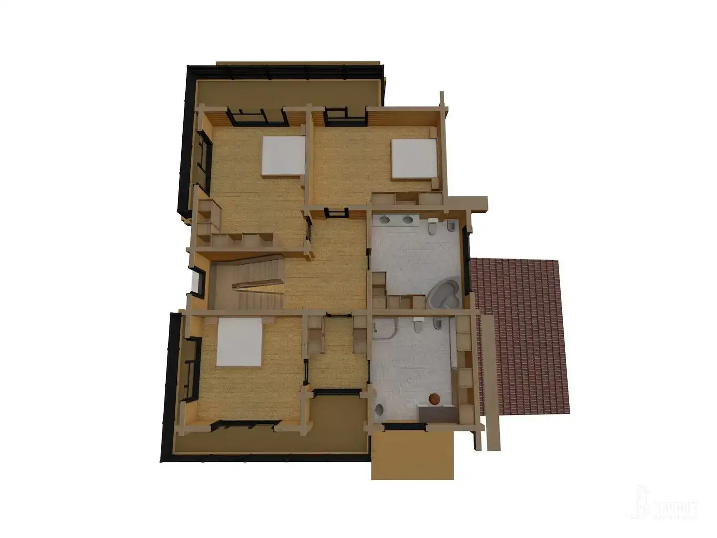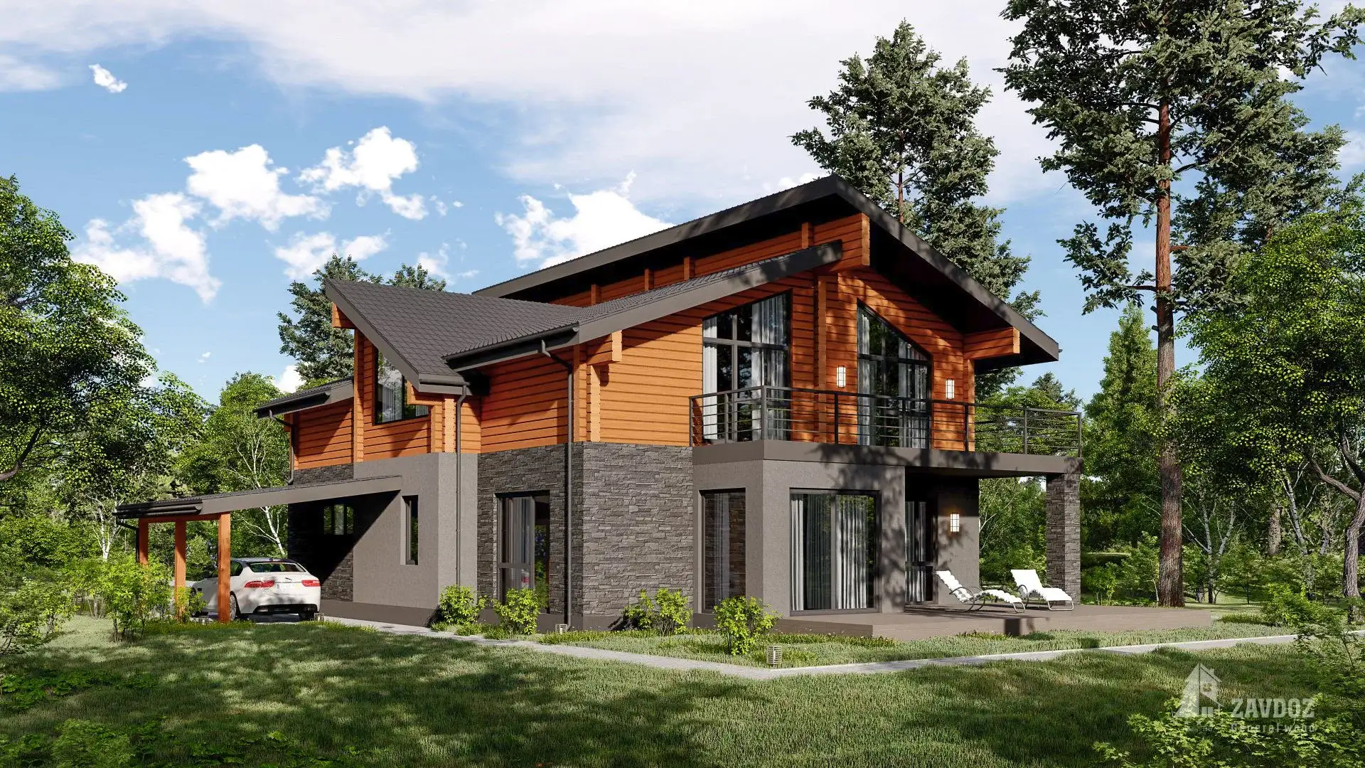 Двухэтажный дом в стиле шале с 4 комнатами, 3 санузлами, мансардой, навесом, террасой и балконом