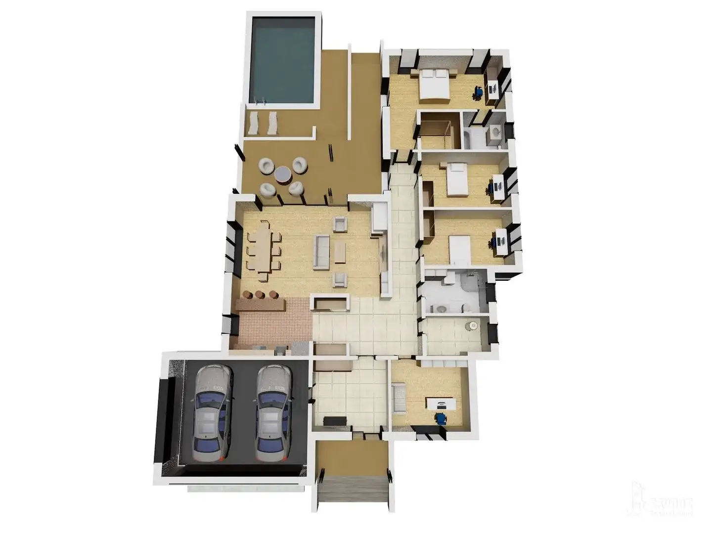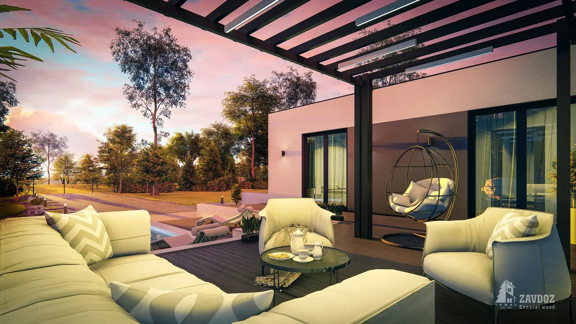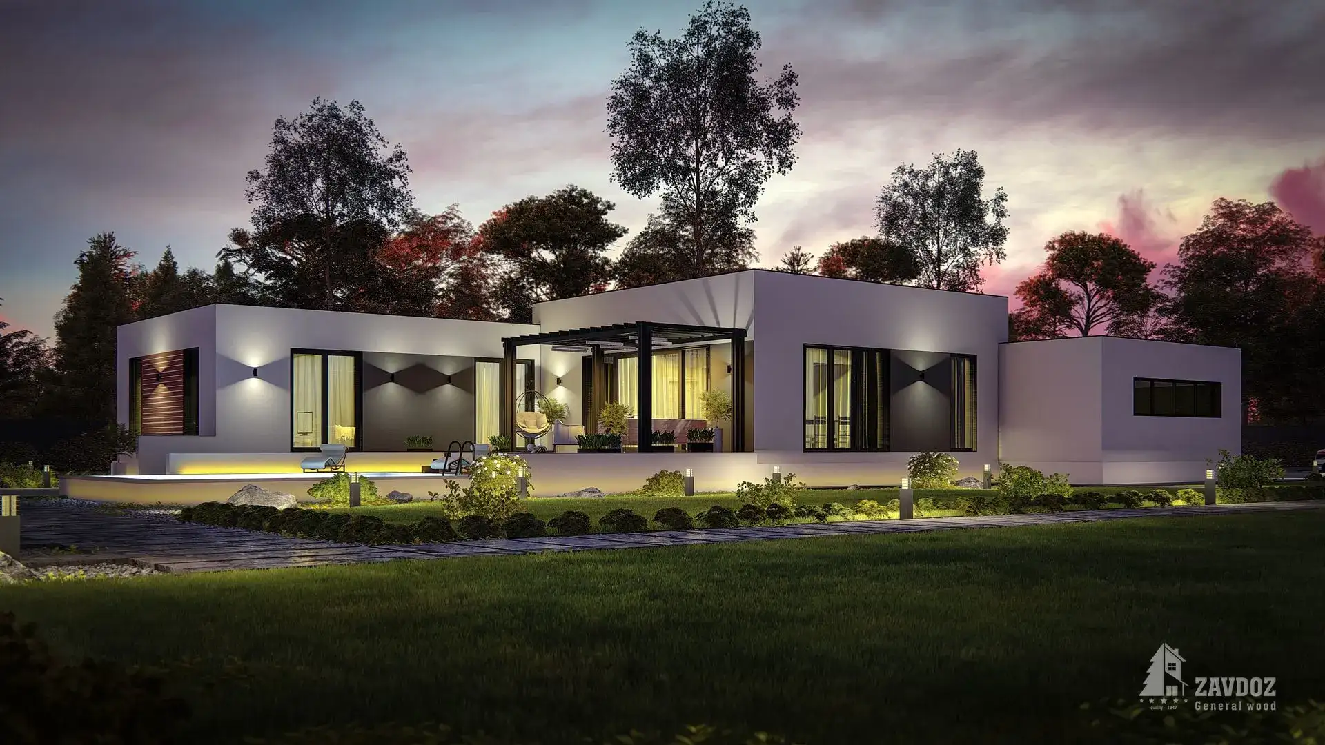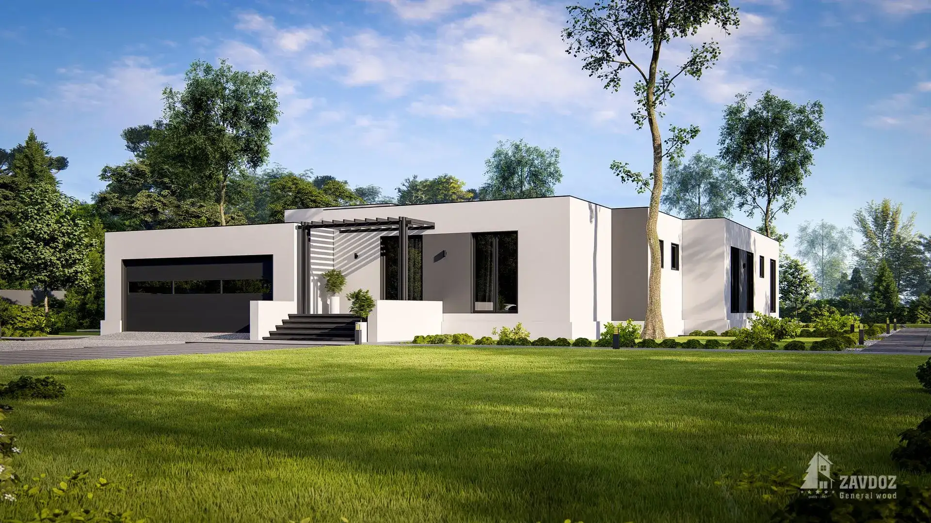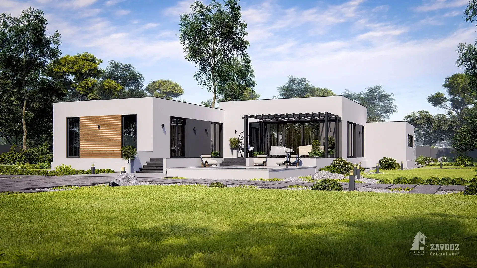 Одноэтажный дом из кирпича, сочетающий в себе жилое пространство и просторную зону отдыха с бассейном и террасой. Современная архитектура в стиле хай-тек, панорамные окна, удобное зонирование.