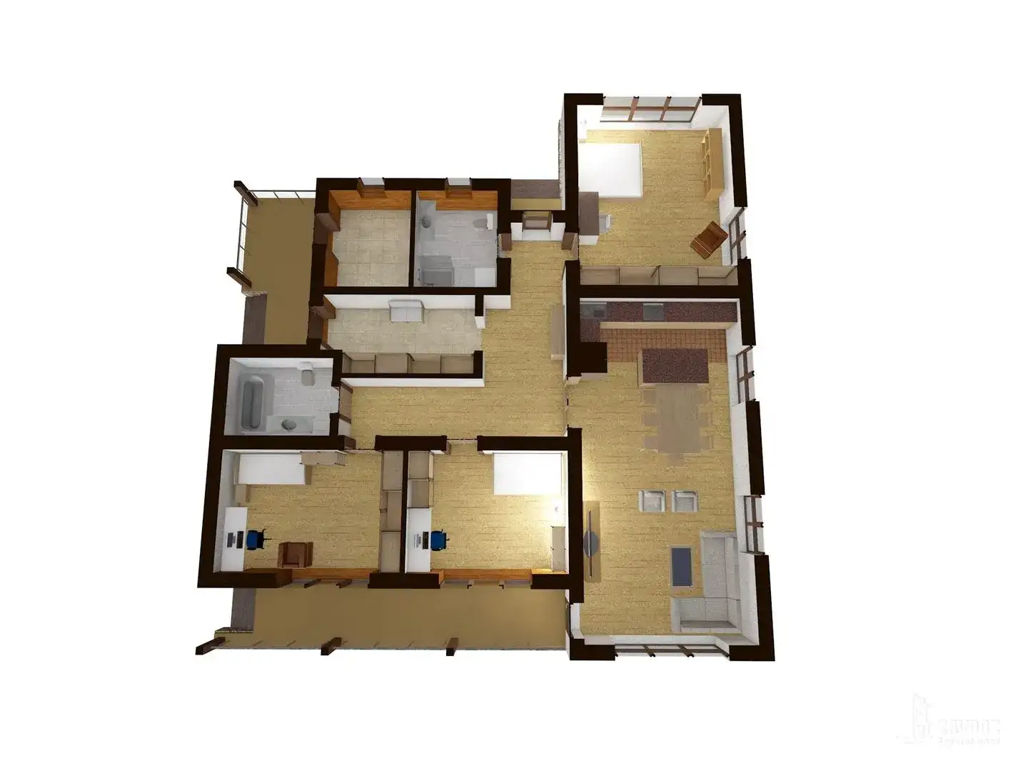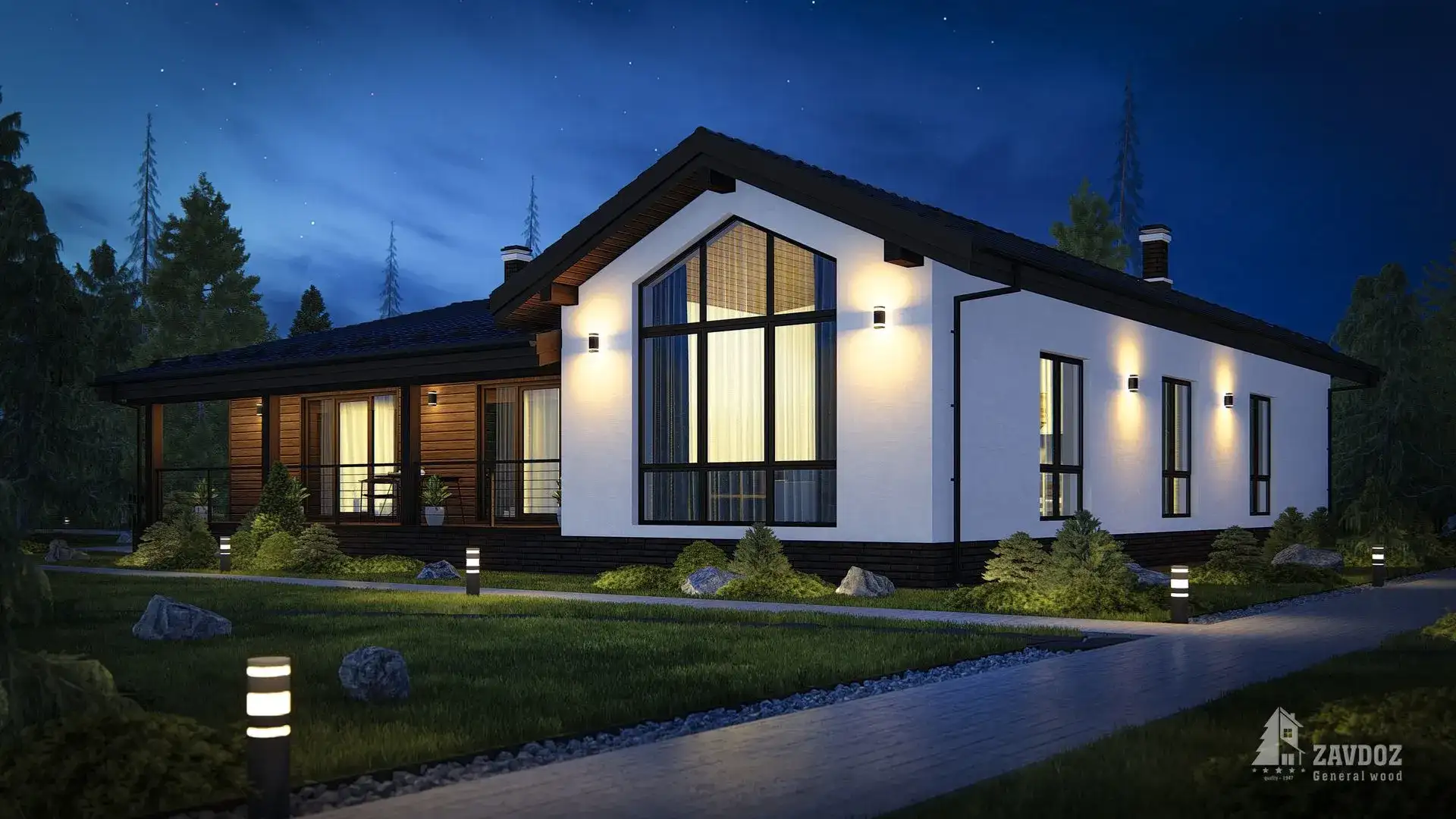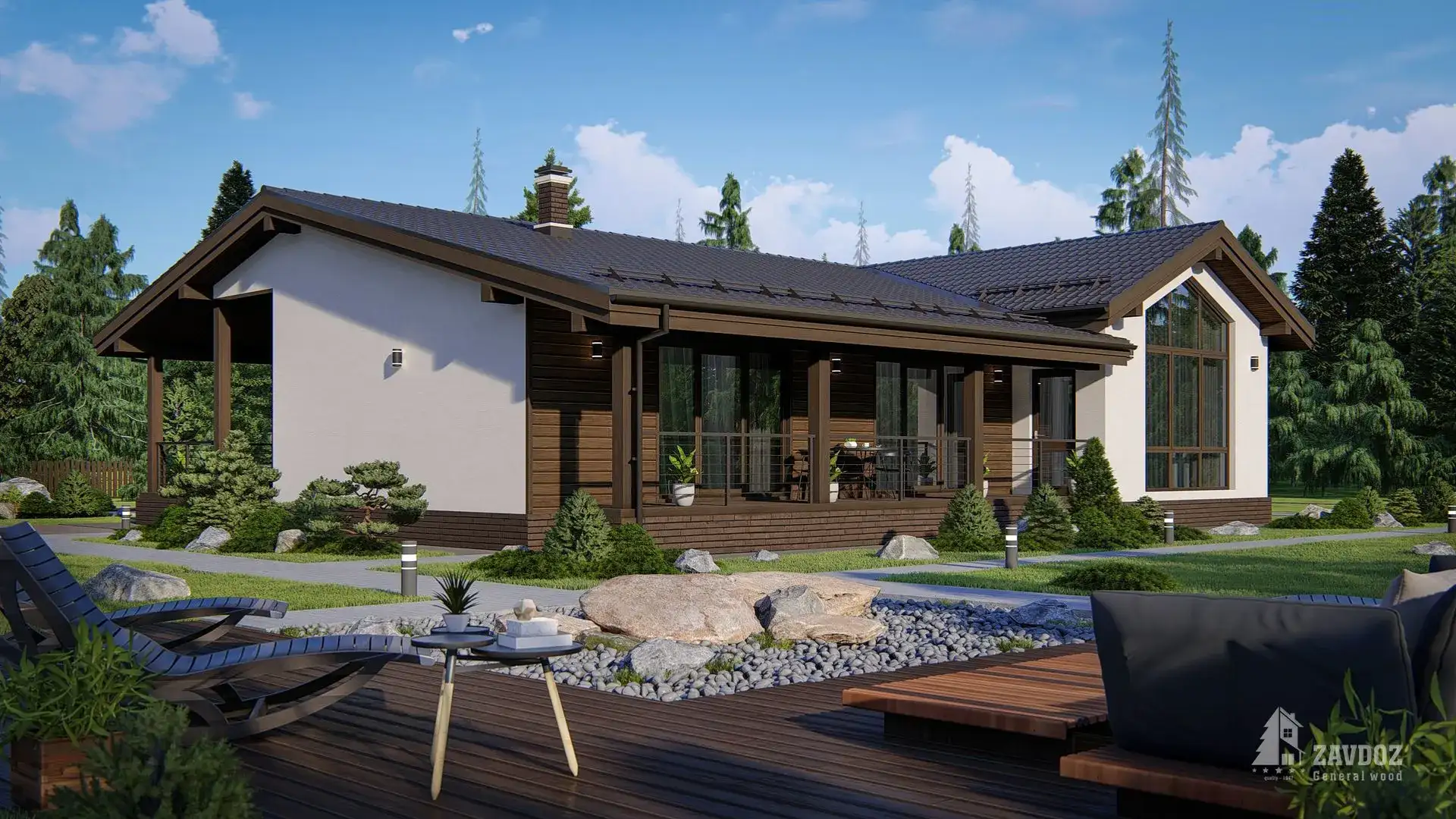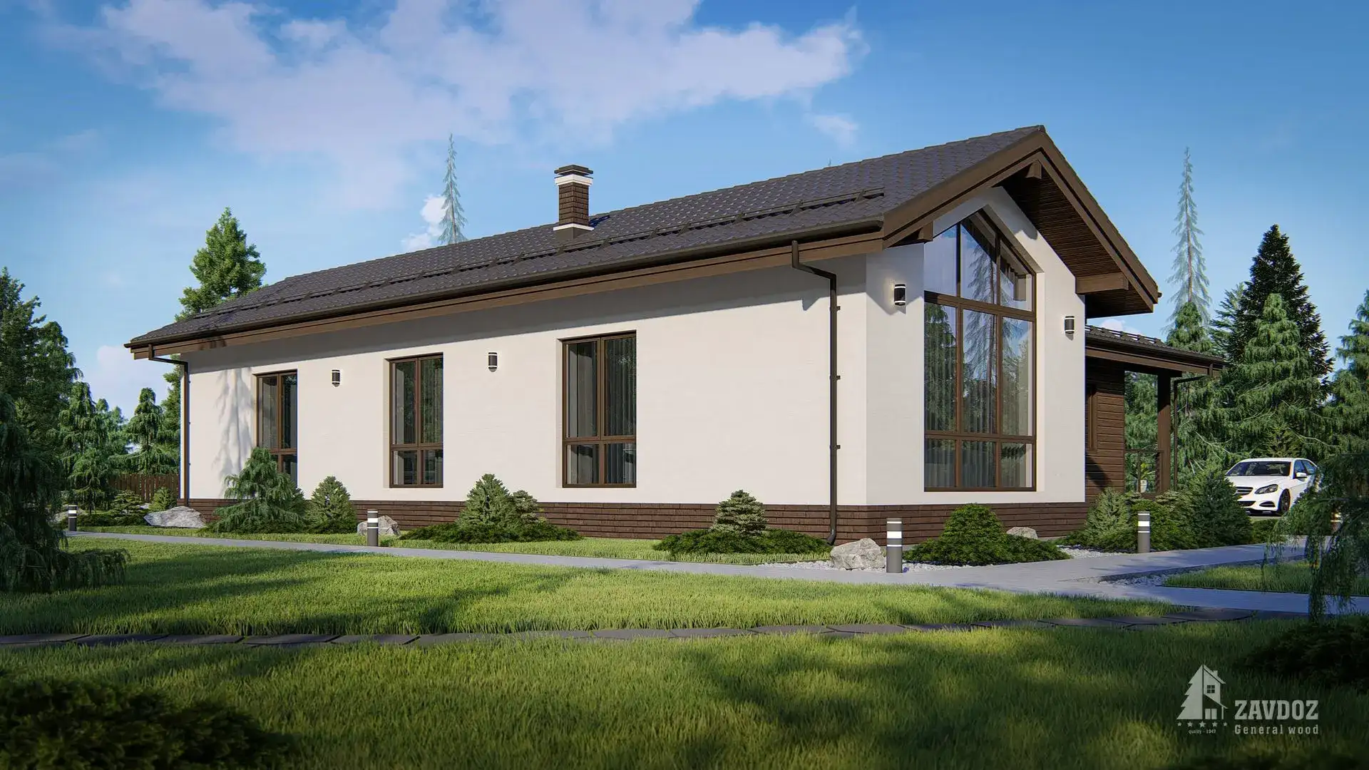 Вместительный одноэтажный дом из кирпича для небольшой семьи. 3 уютные спальни, кухня-гостиная, подсобные помещения, терраса для отдыха с друзьями и близкими с двух сторон здания.