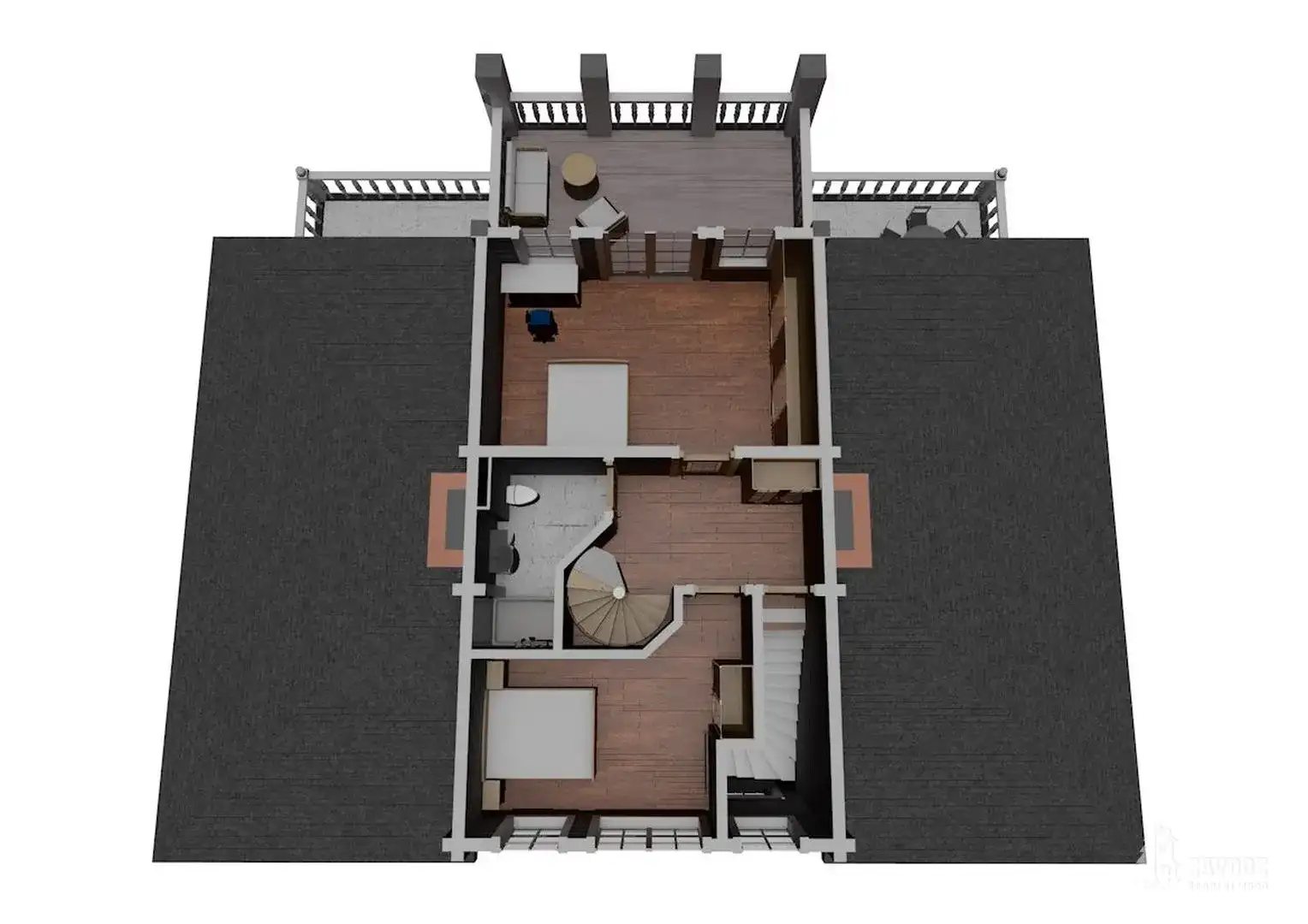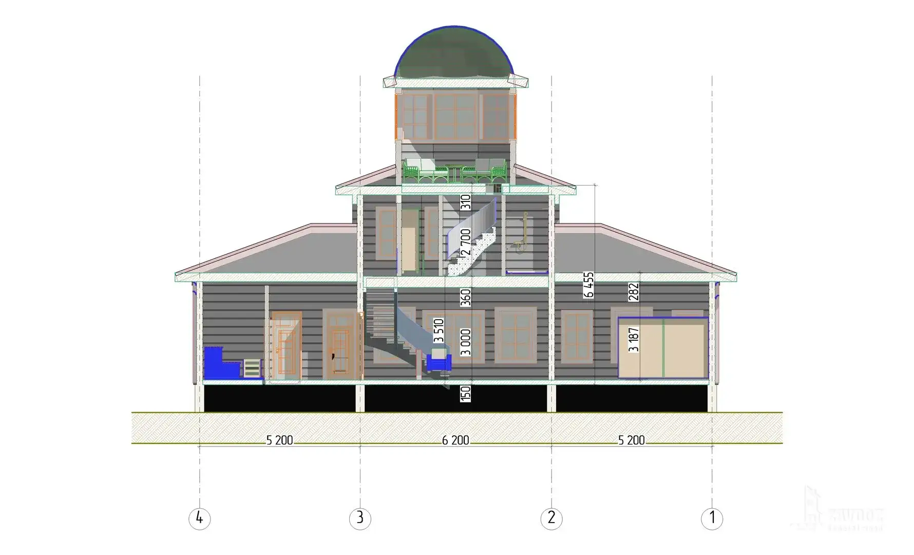 Трёхэтажный дом из клееного бруса в стиле русская усадьба с 4 комнатами, 3 санузлами, террасой и балконом