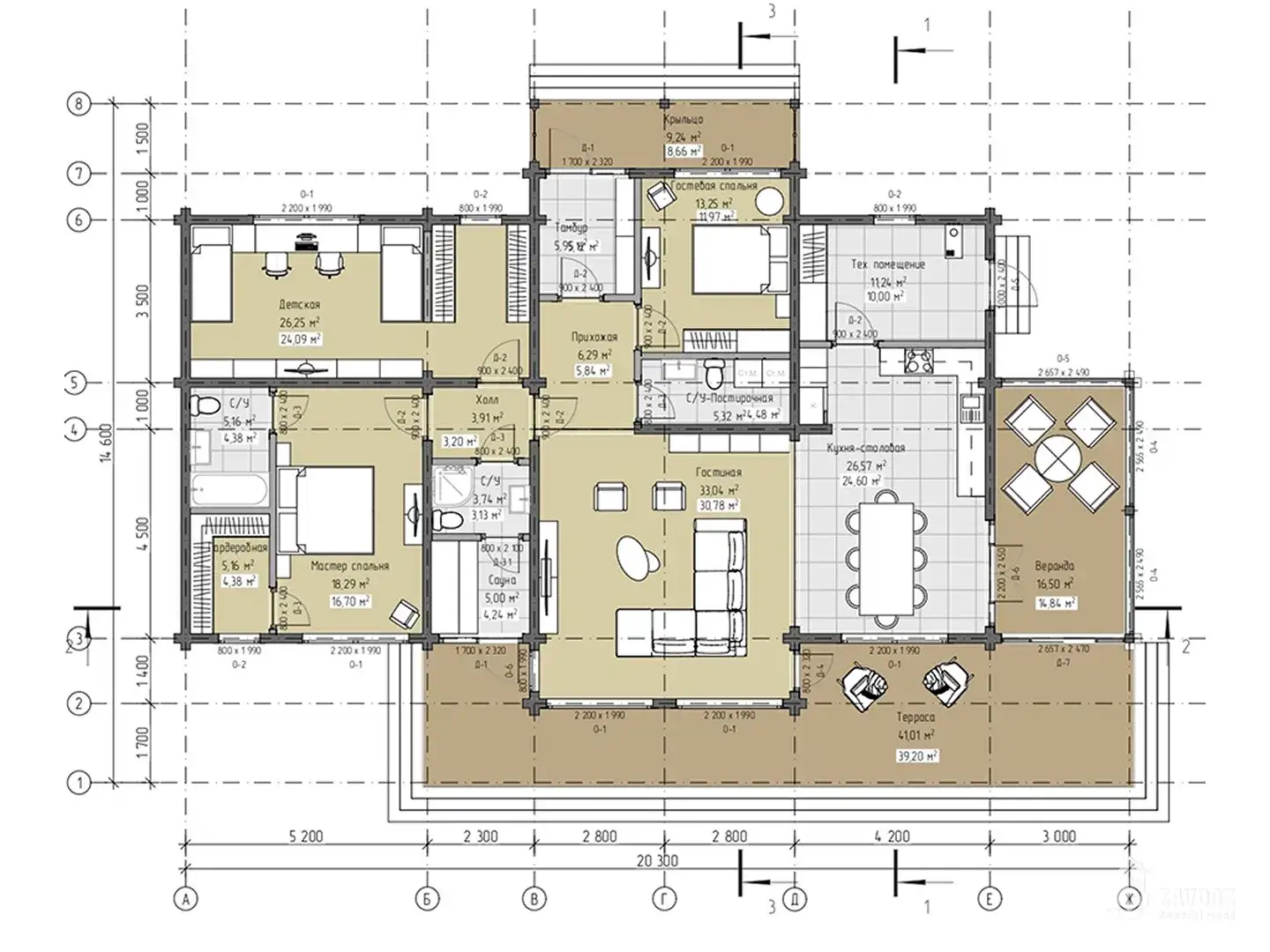 Одноэтажный дом из клееного бруса в скандинавском стиле. 3 спальни, 3 санузла, небольшая сауна, просторная терраса и веранда