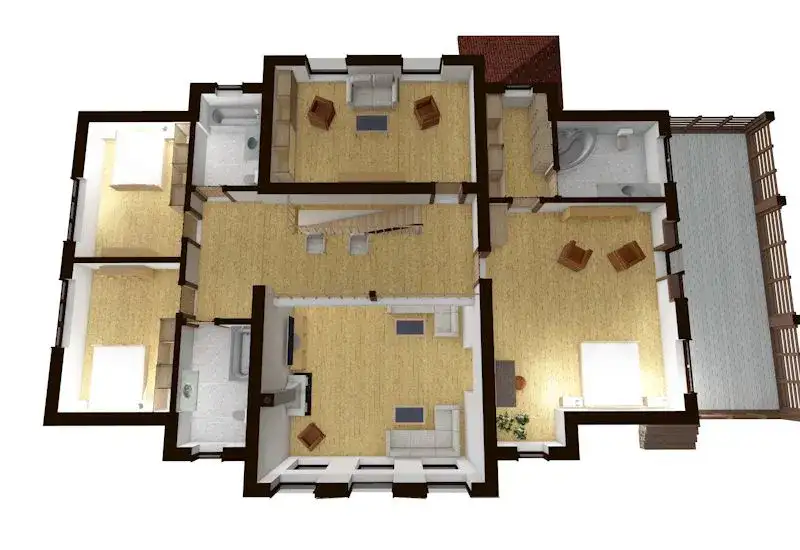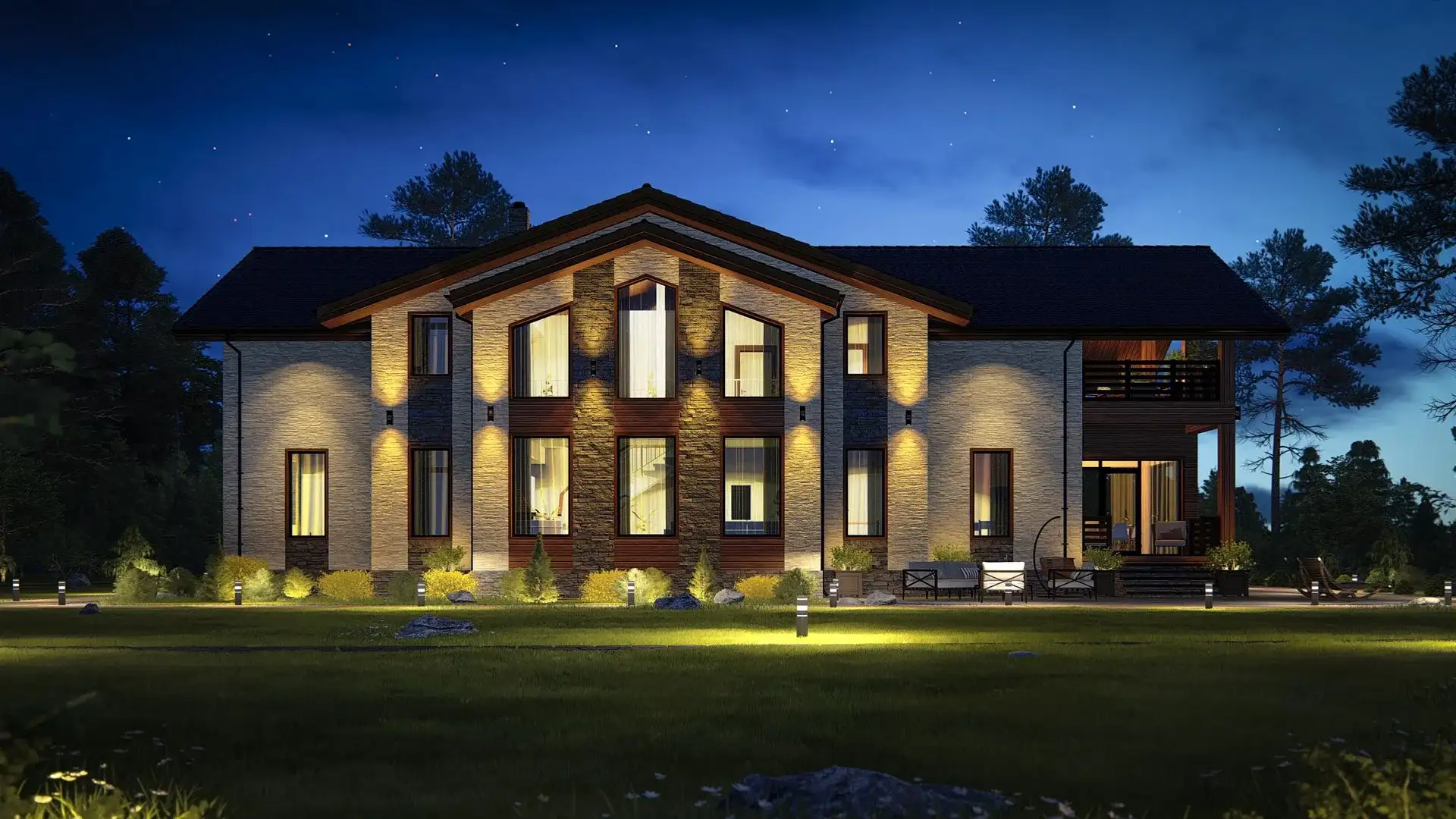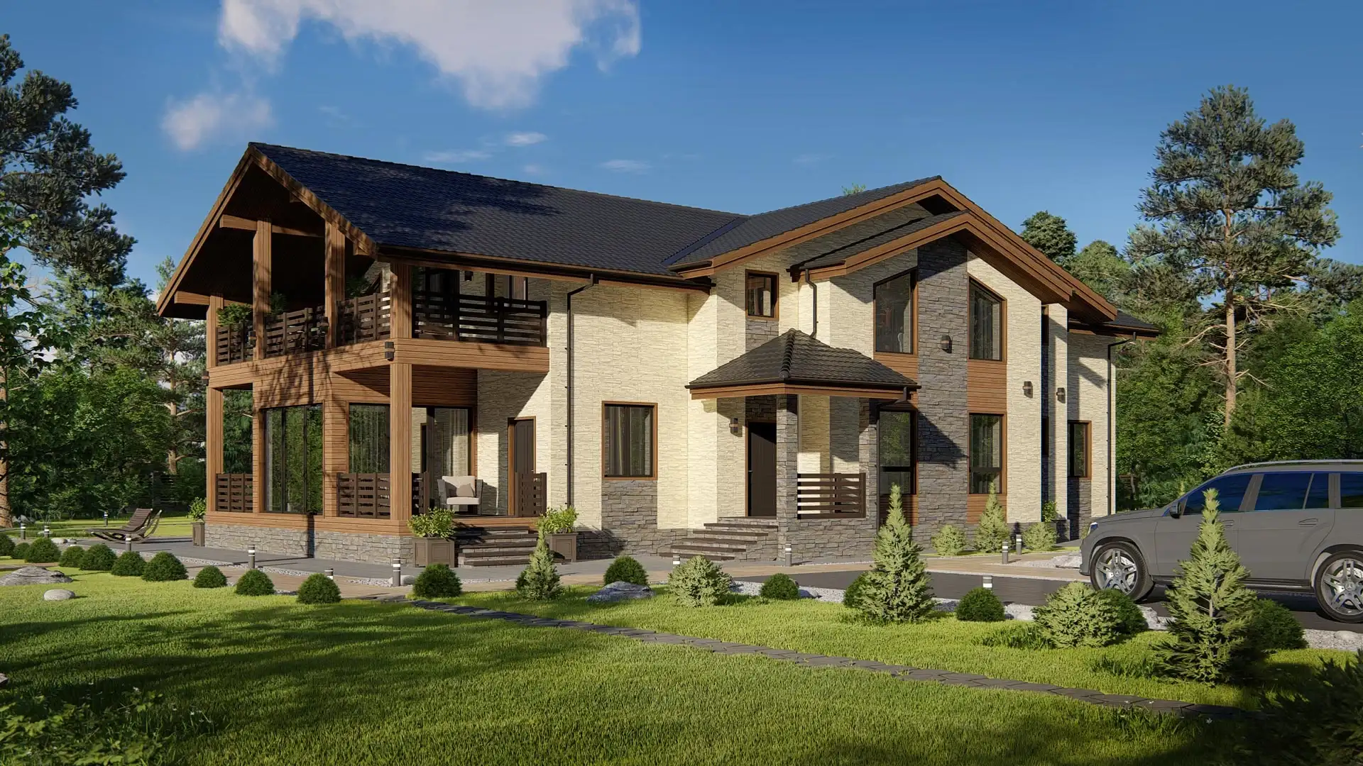 Современный дом из кирпича и клееного бруса в европейском стиле со вторым светом, террасой и уютным балконом. Большая площадь позволит разместить всё самое необходимое, в том числе максимально эффективно использовать свободное пространство. 5 спален, 6 санузлов, светлая гостиная с камином.