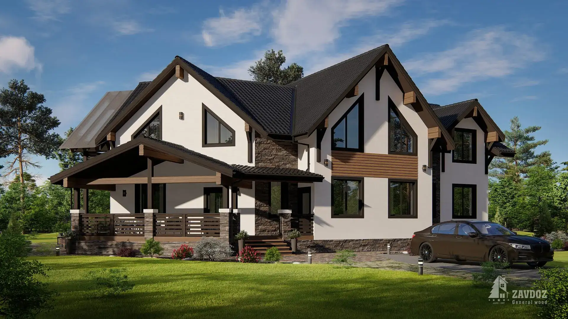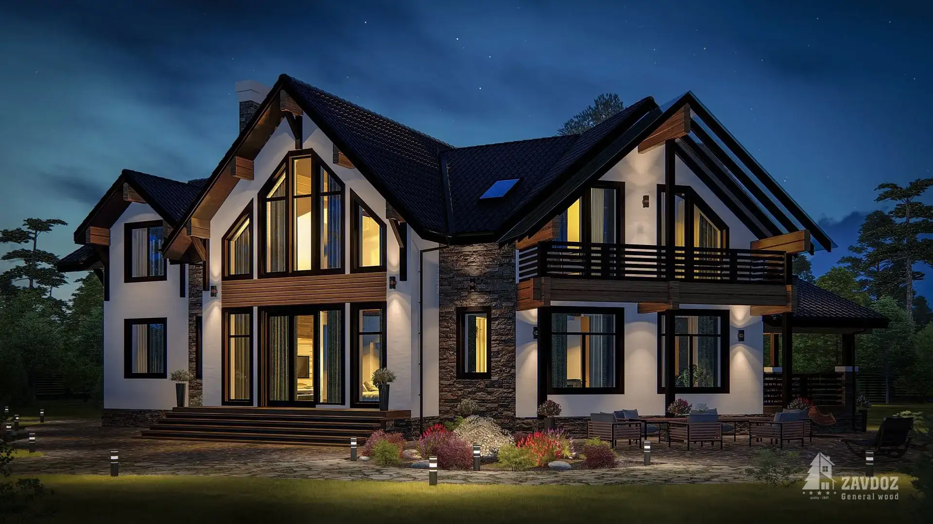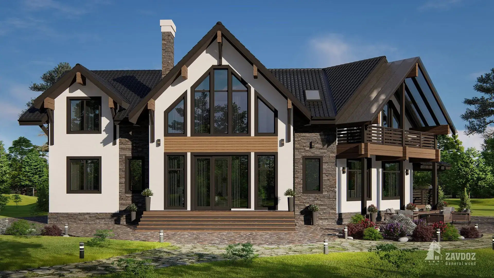 Классический двухэтажный дом из кирпича с двускатной крышей и вторым светом. Коттедж удобно зонирован на основные зоны: на первом этаже — кухня-столовая, просторная гостиная, подсобные помещения, гостевые спальни, кабинет, на втором этаже — спальни, комнаты отдыха, выход на балкон. Также предусмотрена терраса.