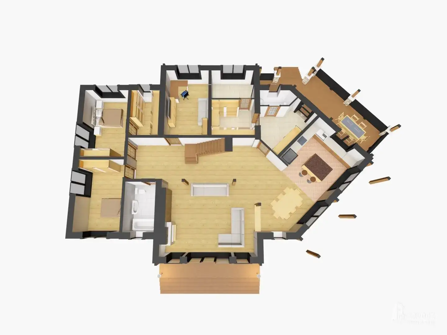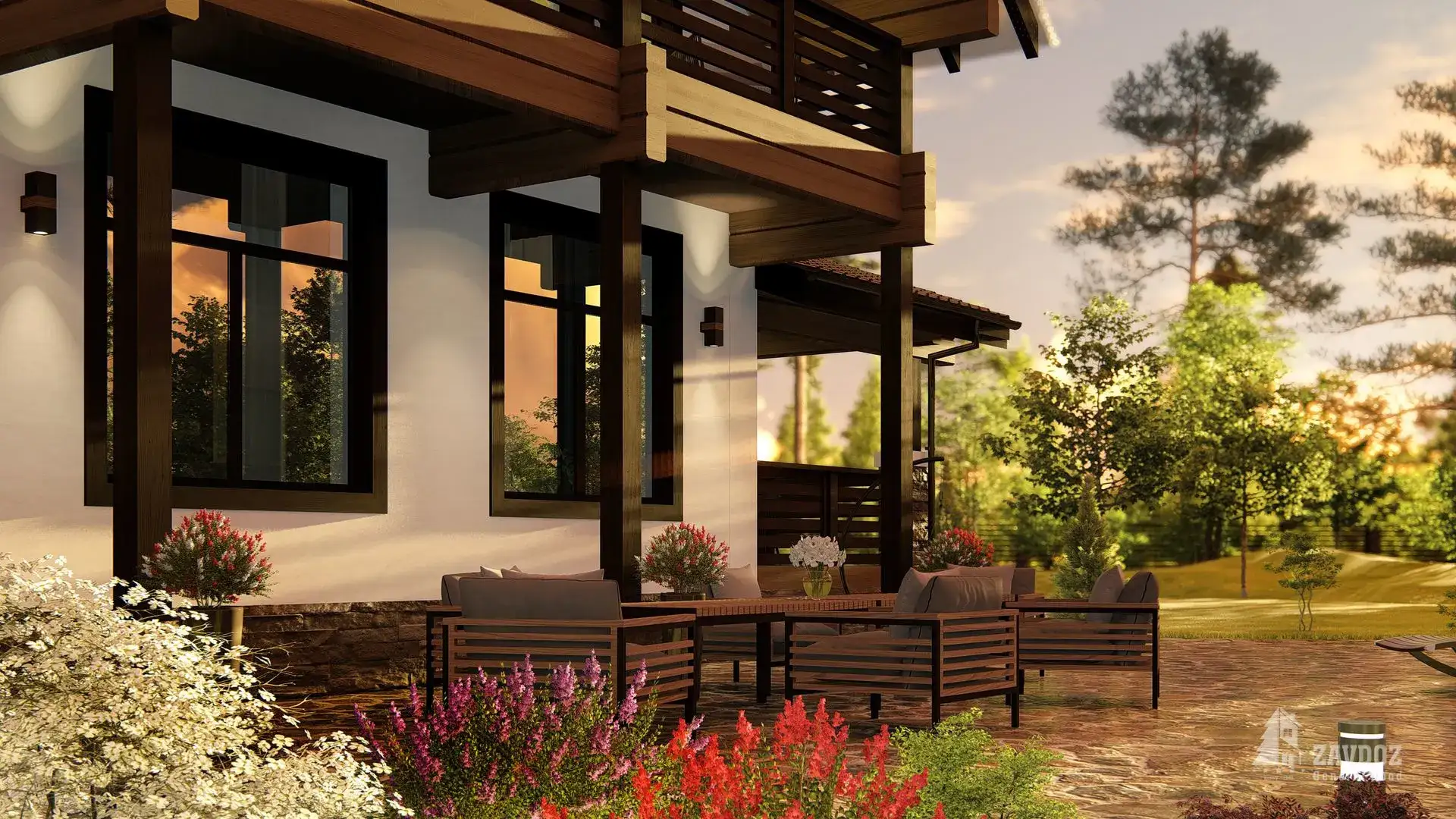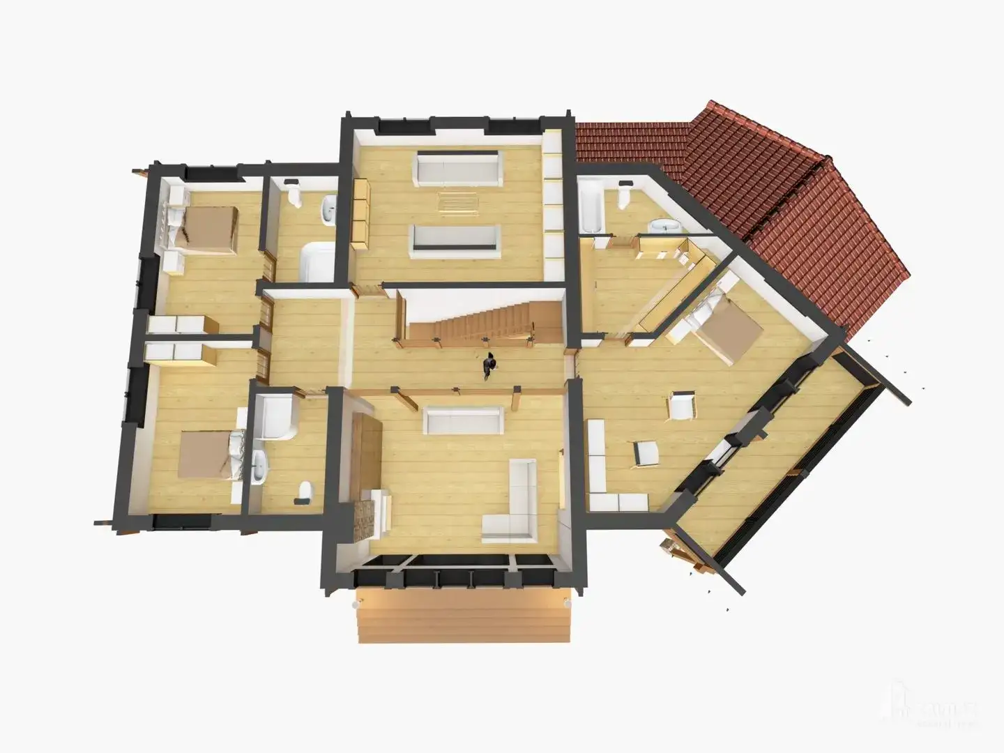 Классический двухэтажный дом из кирпича с двускатной крышей и вторым светом. Коттедж удобно зонирован на основные зоны: на первом этаже — кухня-столовая, просторная гостиная, подсобные помещения, гостевые спальни, кабинет, на втором этаже — спальни, комнаты отдыха, выход на балкон. Также предусмотрена терраса.